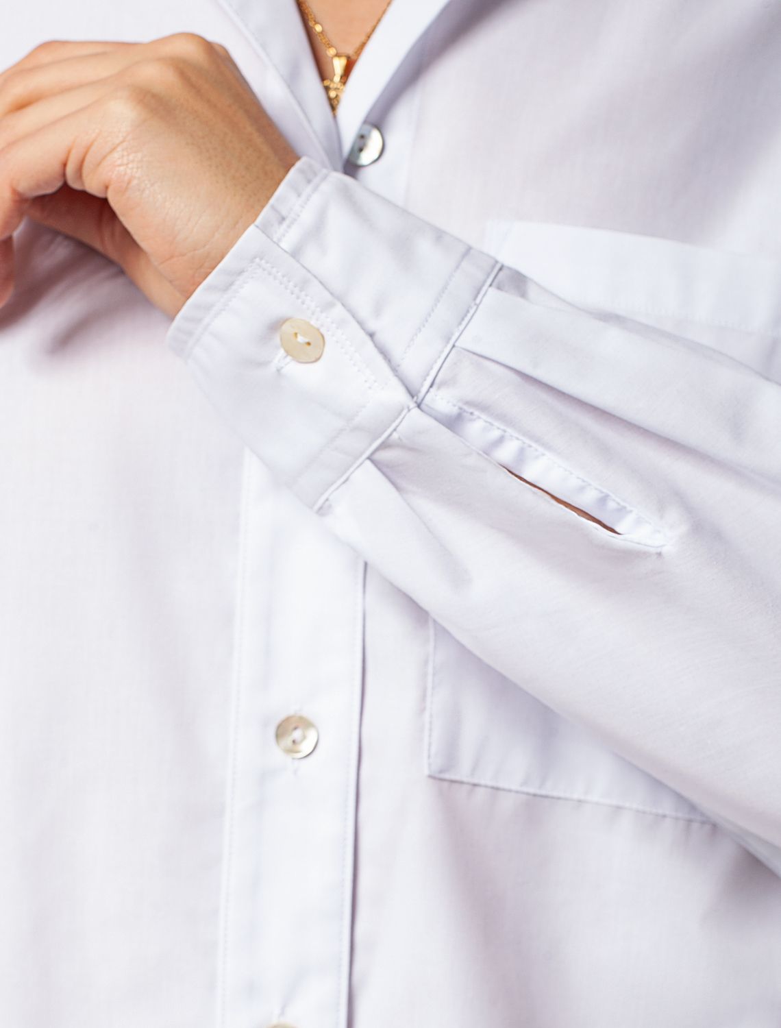 Блузка с цельнокроеным рукавом выполнена из плотного хлопка с добавлением ПЭ. Материал приятно ощущается на коже и почти не мнется, долго сохраняя идеальный внешний вид. Пуговицы из натурального перламутра. На спинке изделия металлический логотип бренда.