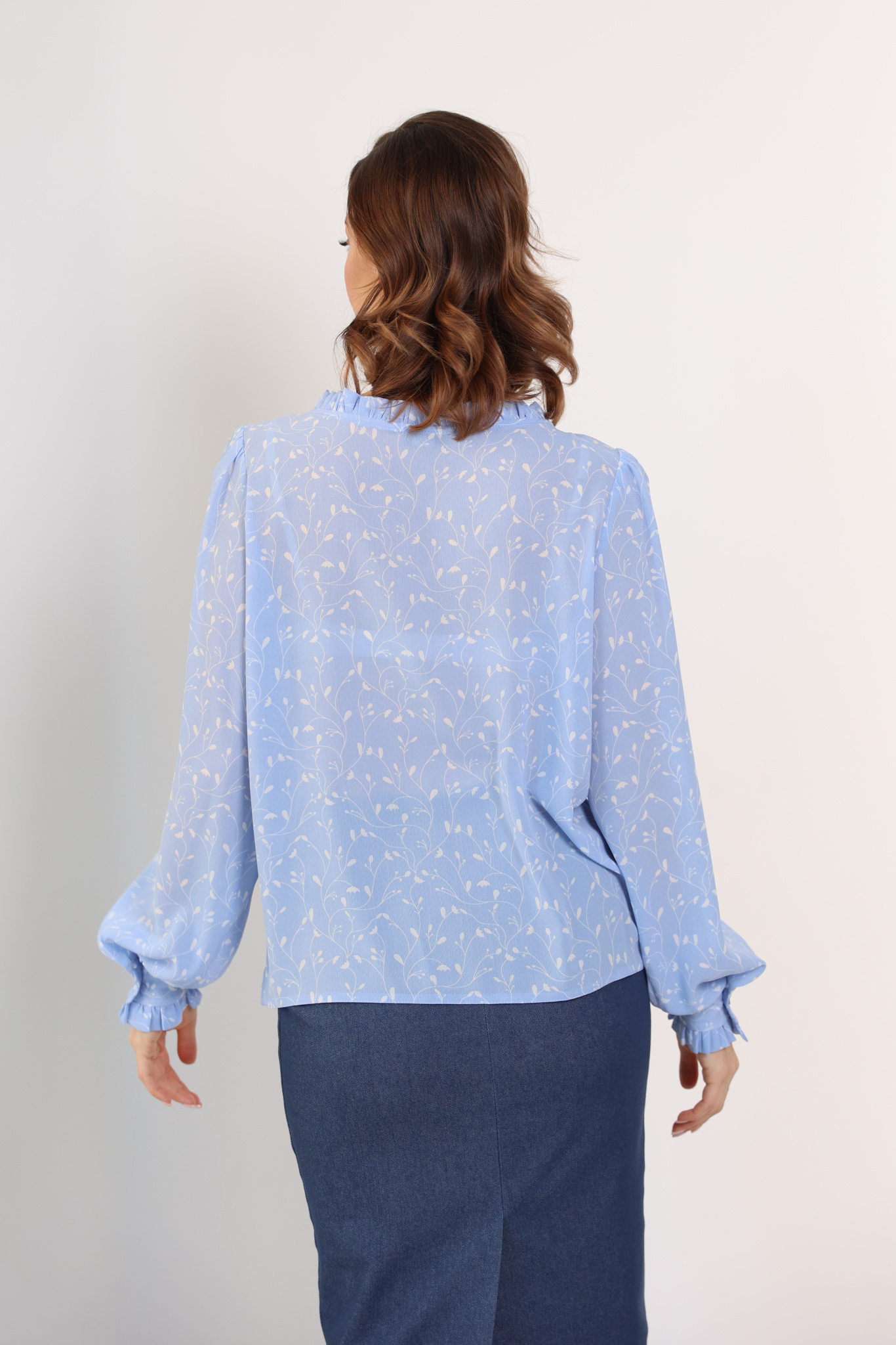 Блузка с круглым вырезом горловины, завязками и рюшей. Втачной рукав со сборкой по окату манжета и рюша по низу рукава.