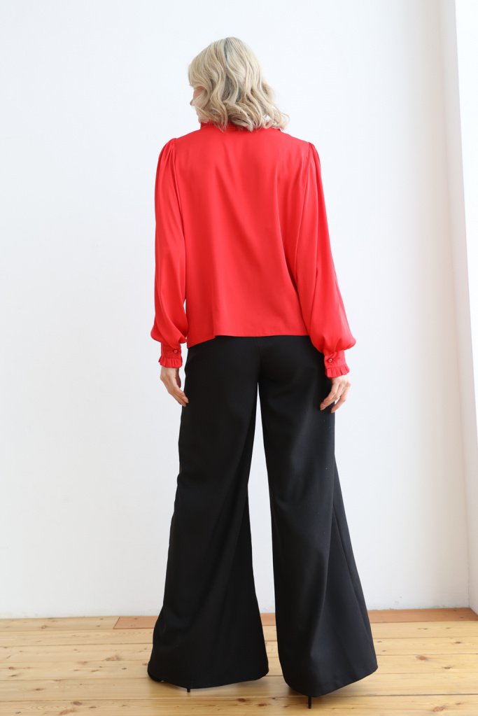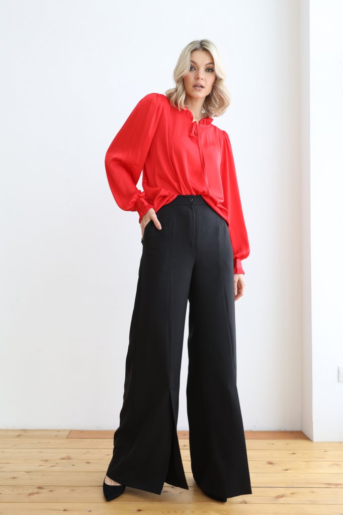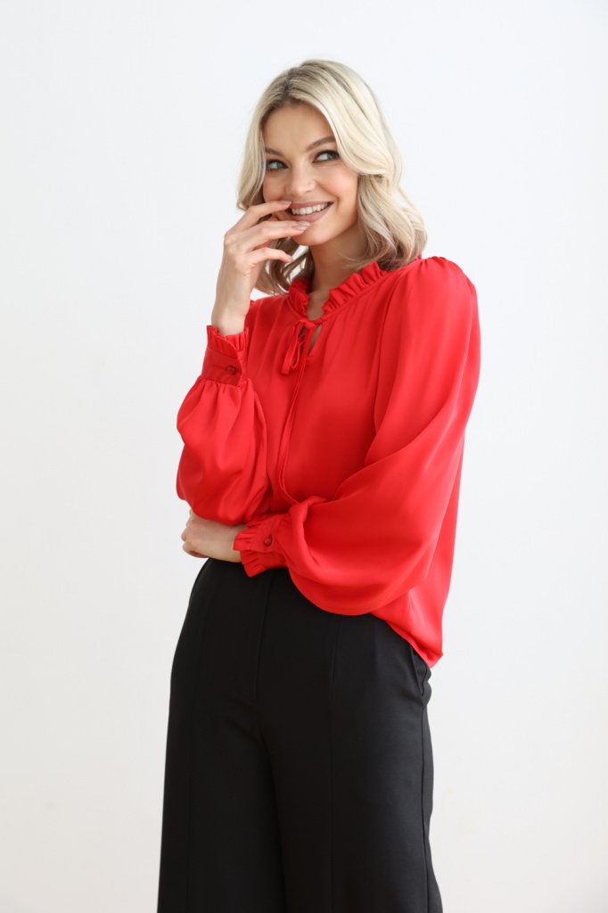 Блузка из искусственного шелка с круглым вырезом горловины, завязками и рюшей. Втачной рукав со сборкой по окату, манжета, застегивающаяся на 1 пуговицу и рюша по низу рукава.