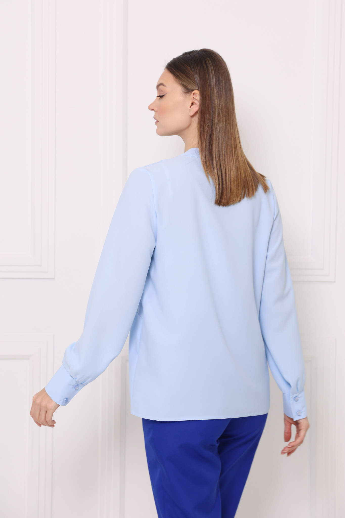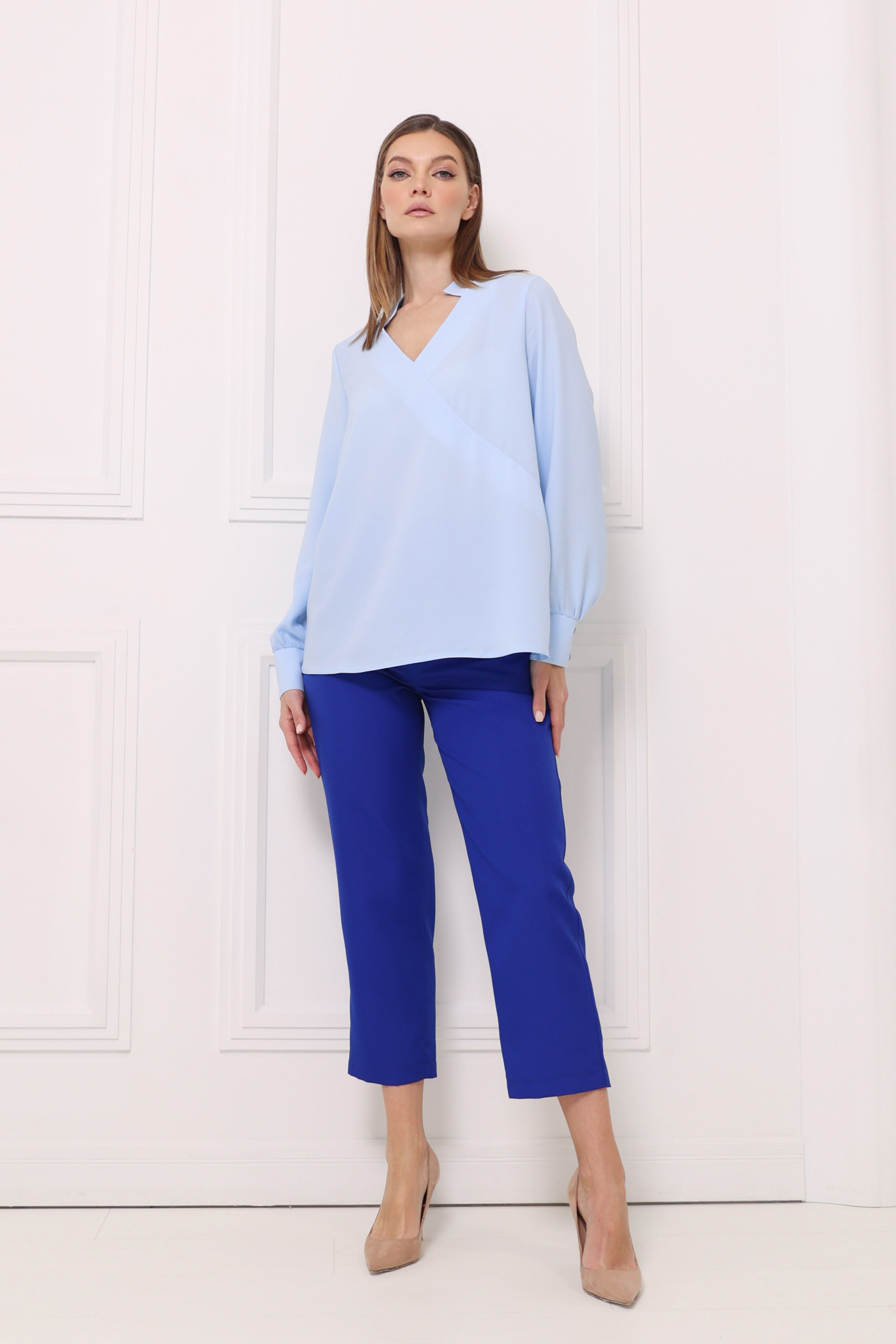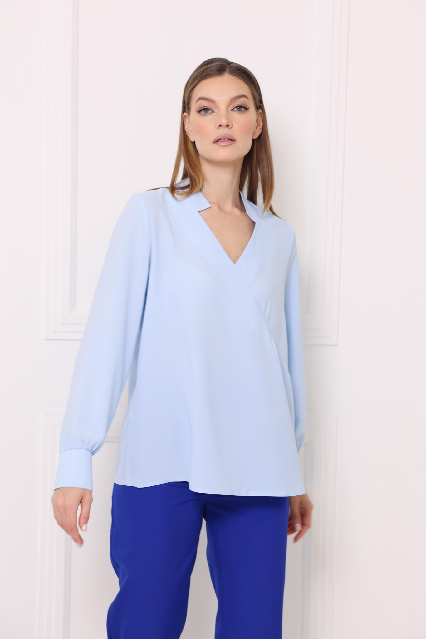 Блузка прямого кроя выполнена с эффектом запАха. Фигурный ворот. Длинный, втачной рукав на широкой манжете. Изделие без застёжки.