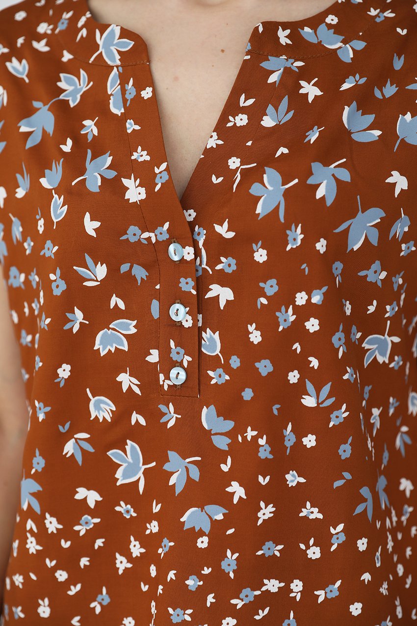 Блузка прямого кроя с цельнокроенным рукавом, фигурным вырезом горловины и планкой, застегивающейся на 3 пуговицы.