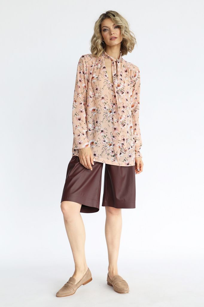 Блузка из шифона прямого кроя, оригинальным воротником с шарфом и глубоким v-вырезом, втачными рукавами и манжетами с застежкой на пуговицу.
