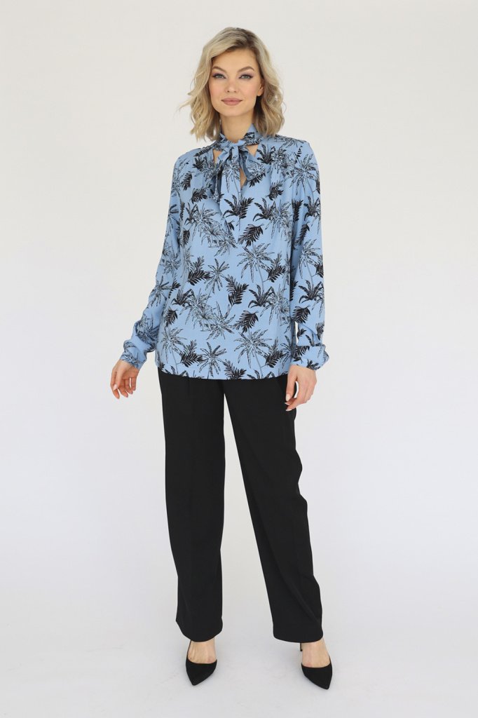 Блузка из вискозы прямого кроя, оригинальным воротником с шарфом и глубоким v-вырезом, втачными рукавами и манжетами с застежкой на пуговицу.