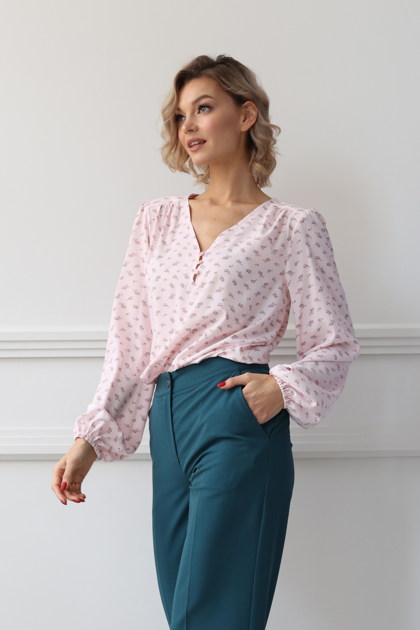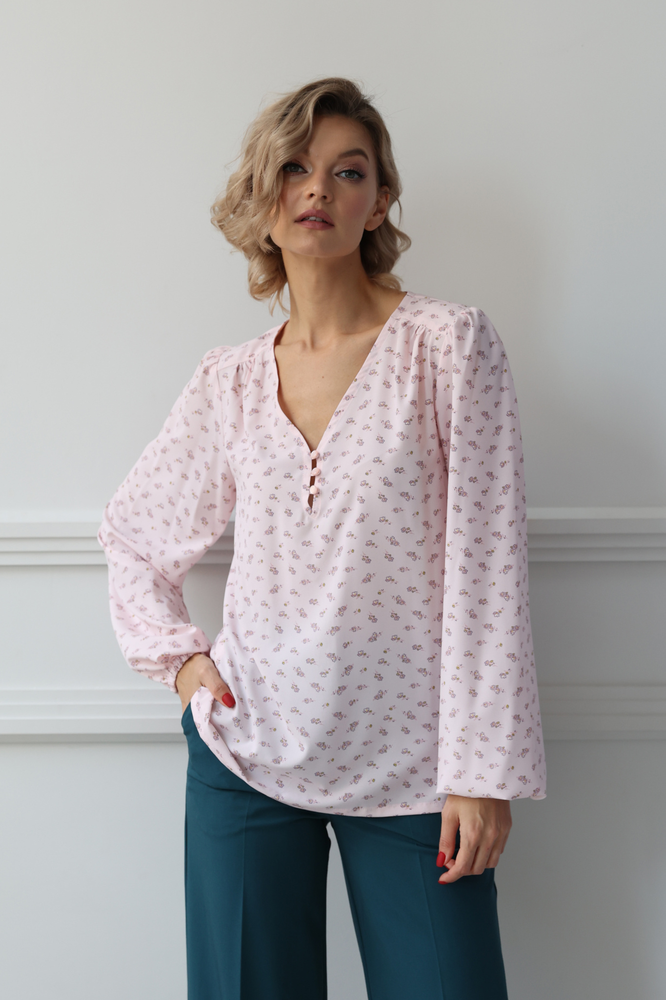Блузка из soft шелка – стрейч прямого кроя с глубоким v-вырезом с застежкой на три пуговицы, втачными рукавами и резинкой по низу рукава.