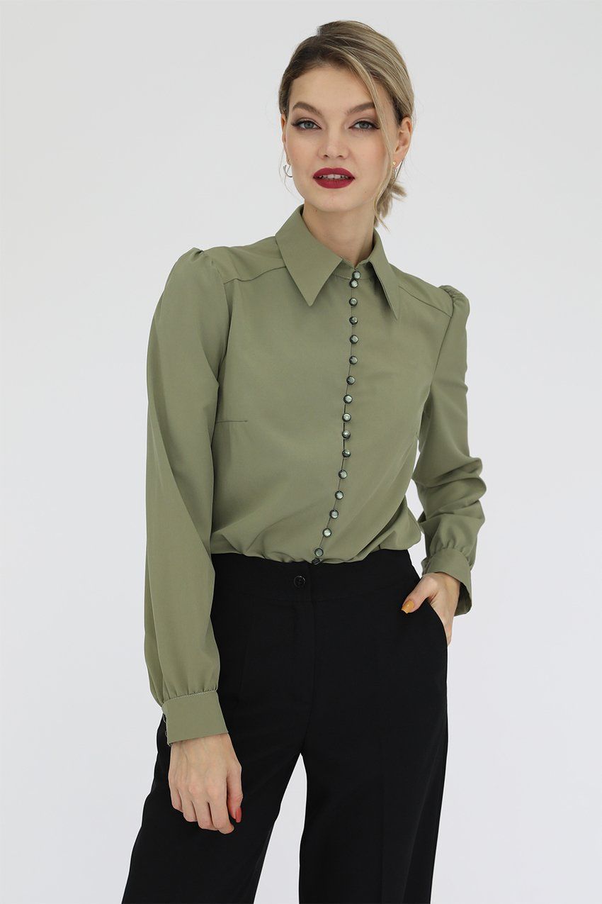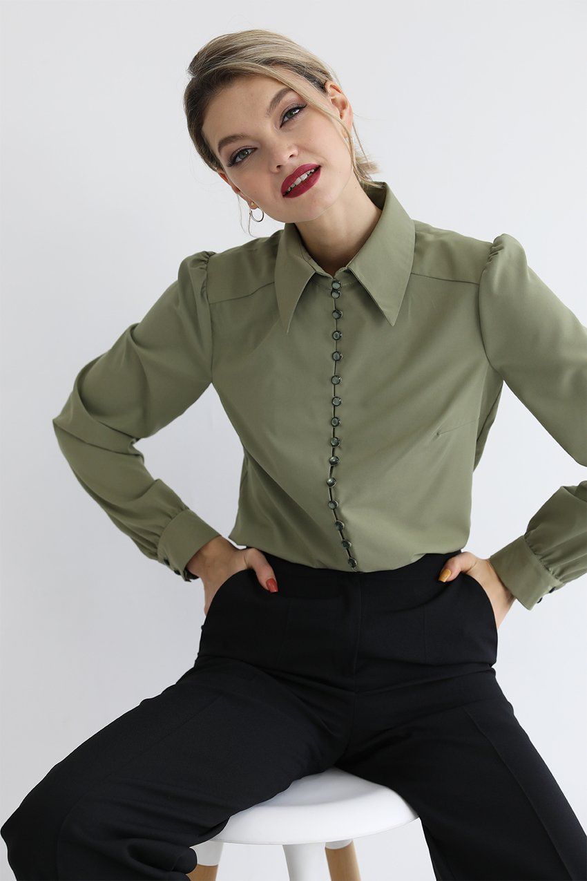 Блузка из искусственного шелка с навесными петлями и пуговицами, длинными рукавами и манжетами, сборкой по окату рукава, кокеткой на спинке и отложным воротником на стойке.