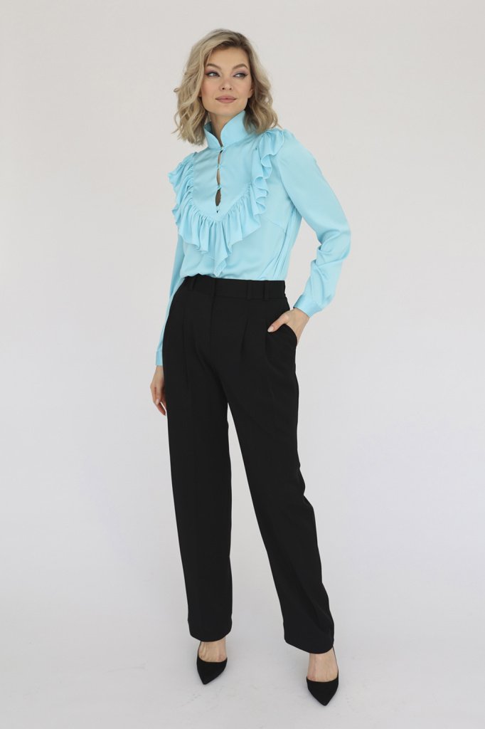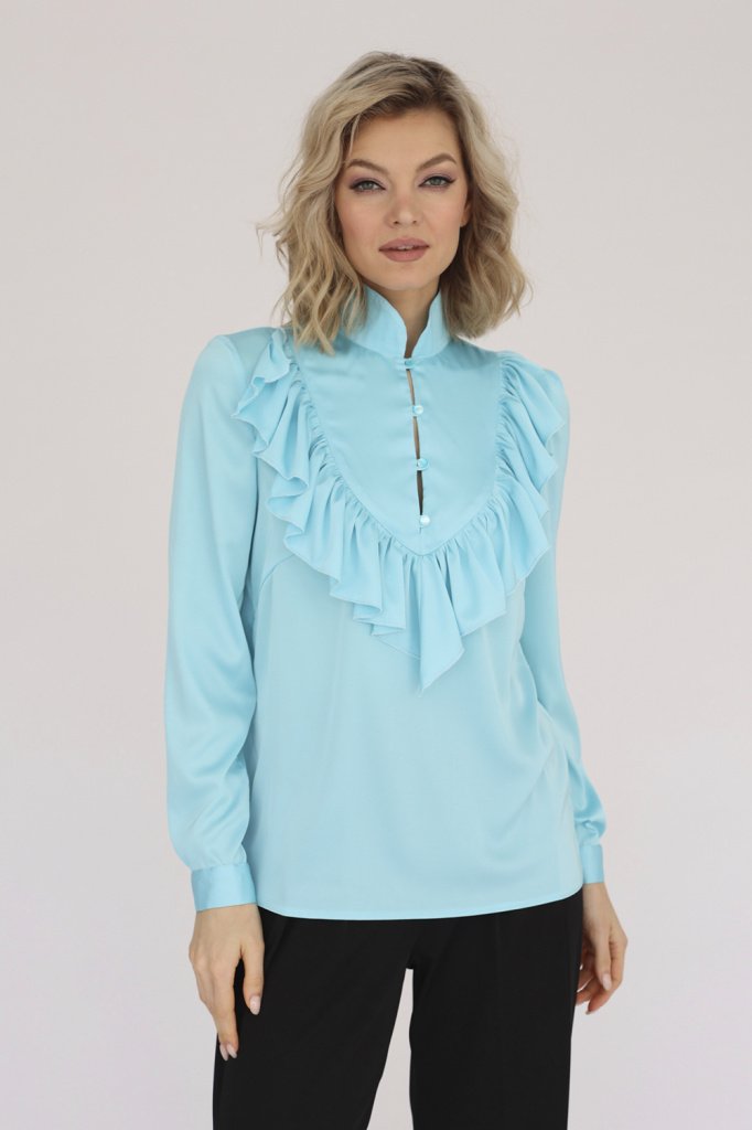 Блузка с воротником-стойкой и втачными рукавами с манжетами, оборкой по переду и застежкой на пуговицы.