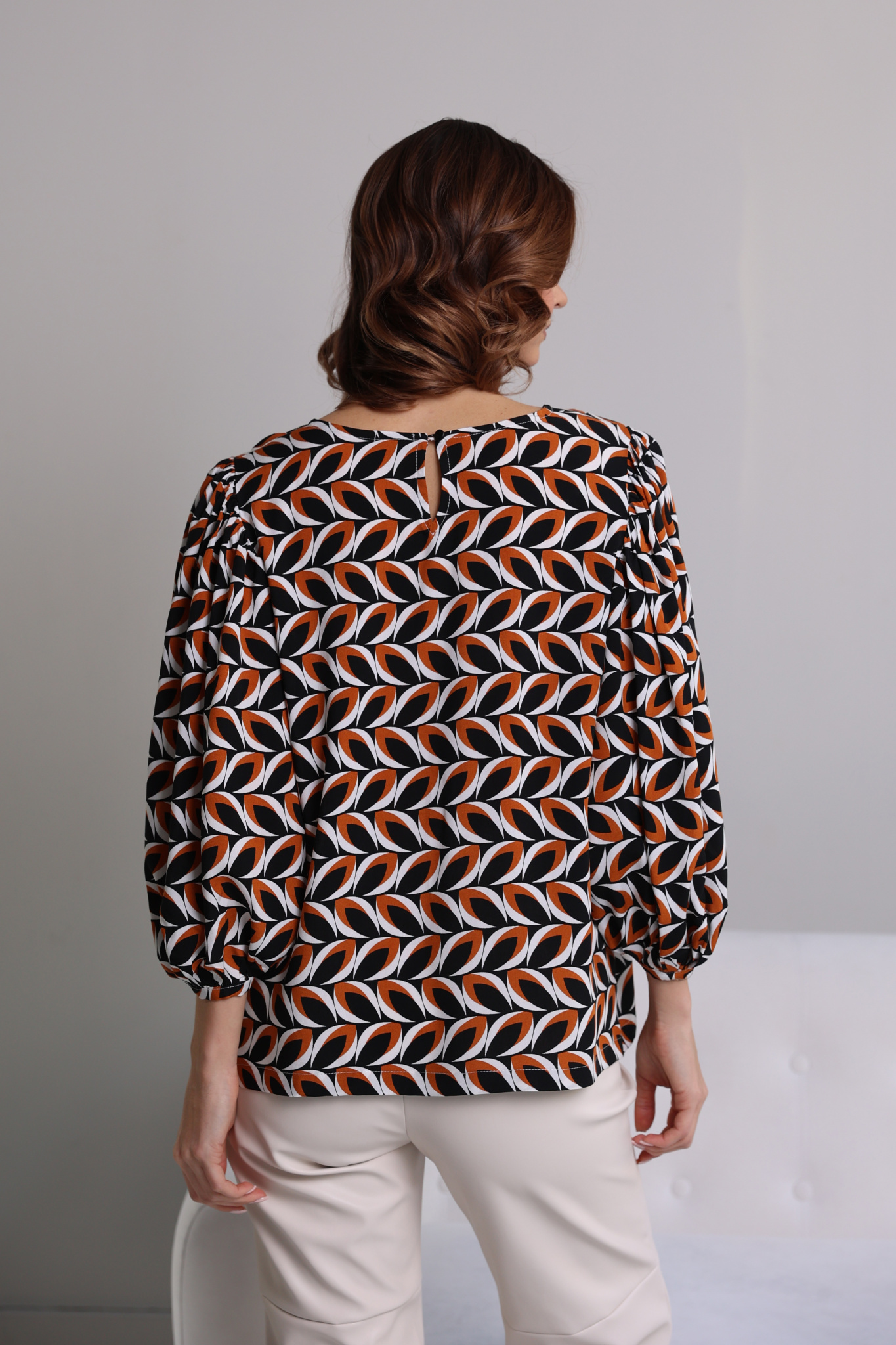 Блузка прямого кроя с круглым вырезом горловины. Пышные рукава со сборкой по окату  и по низу рукава. По спинке изделия вырез-капелька, застегивающийся на пуговицу.