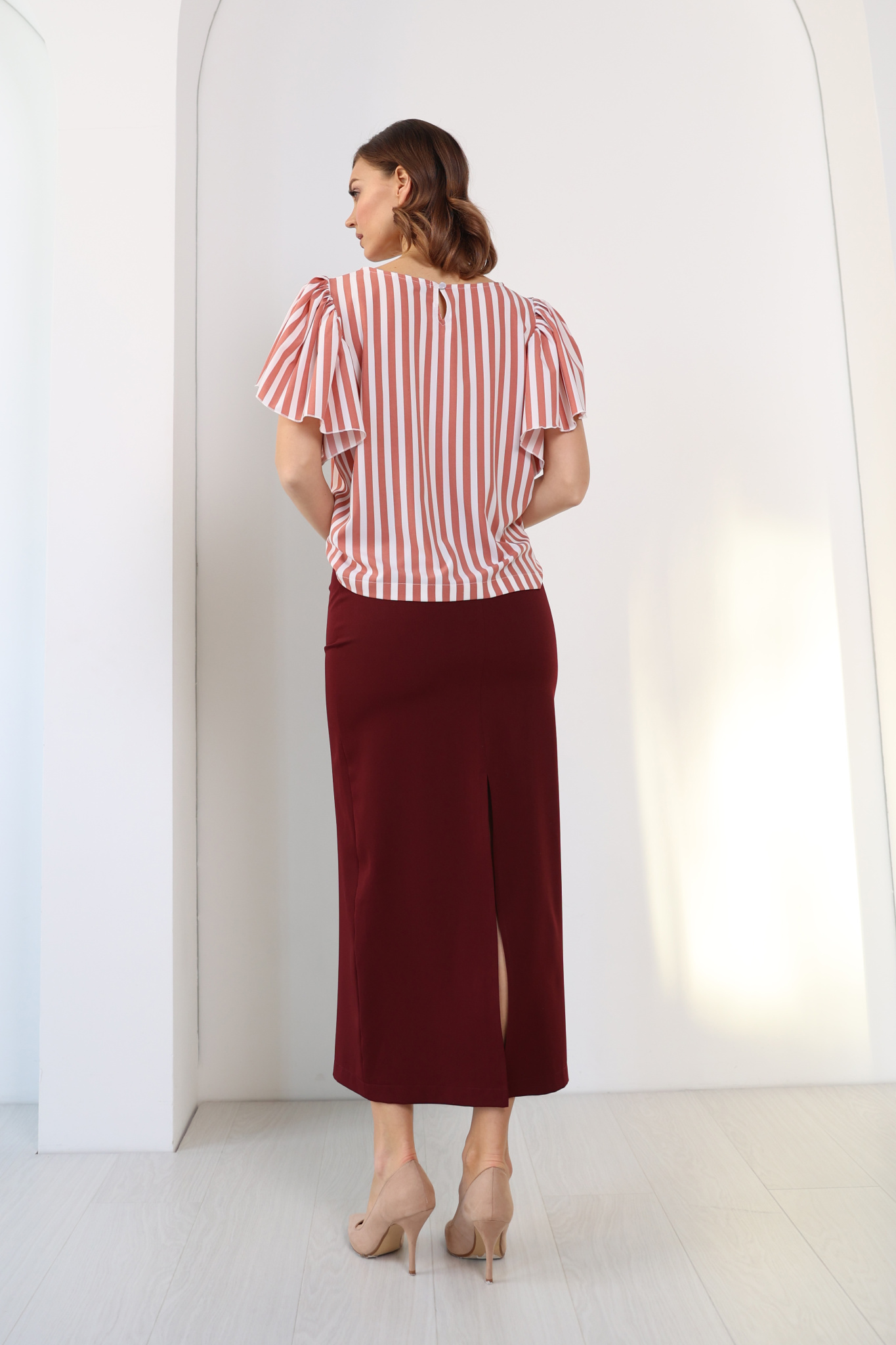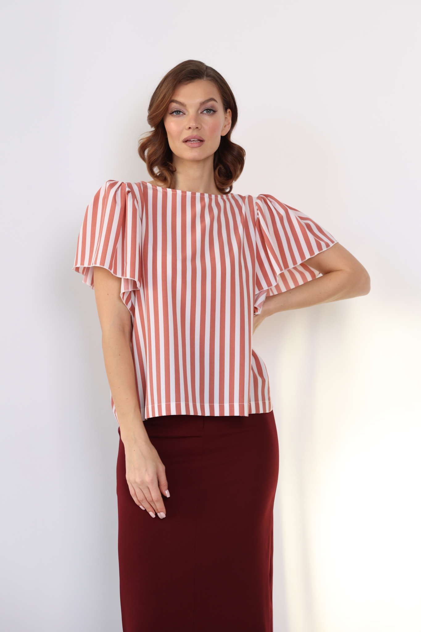 Блузка прямого кроя с рукавом-бабочка, круглой горловиной и застежкой на пуговицу сзади.