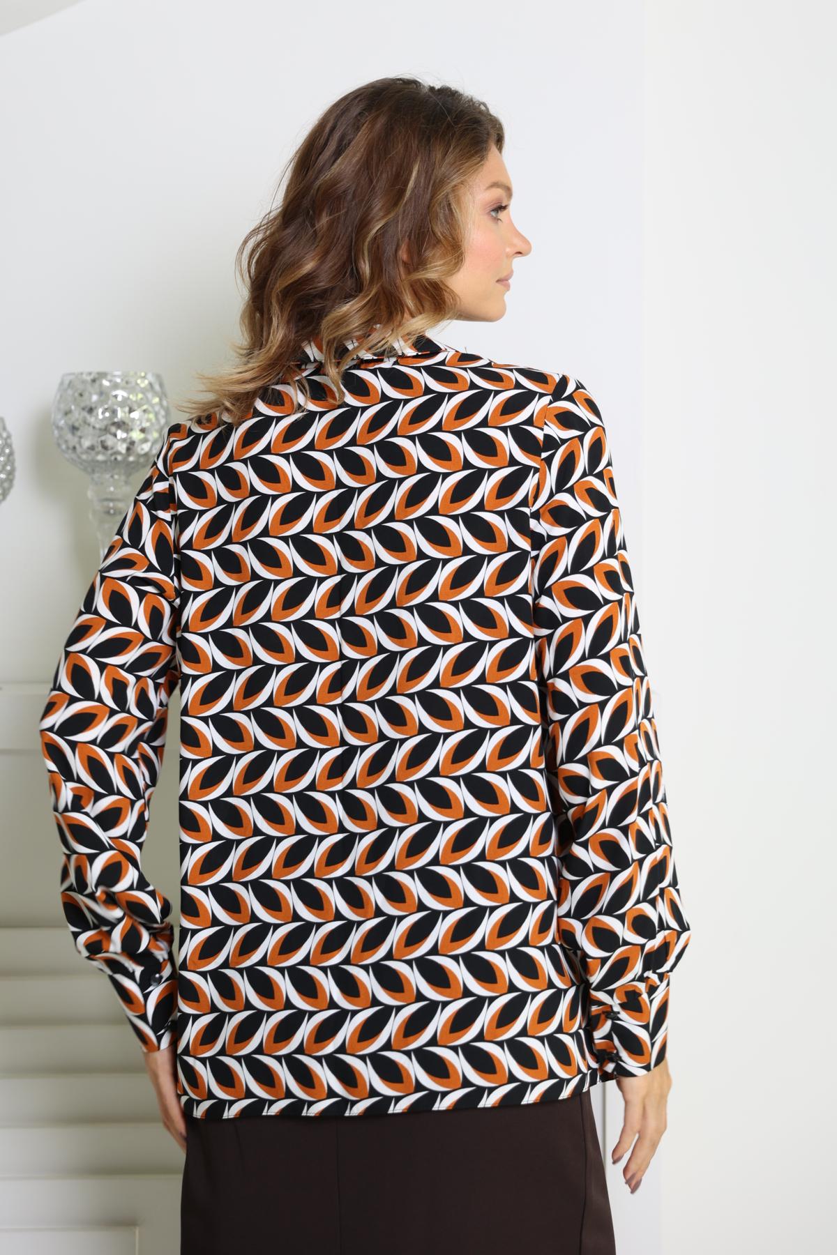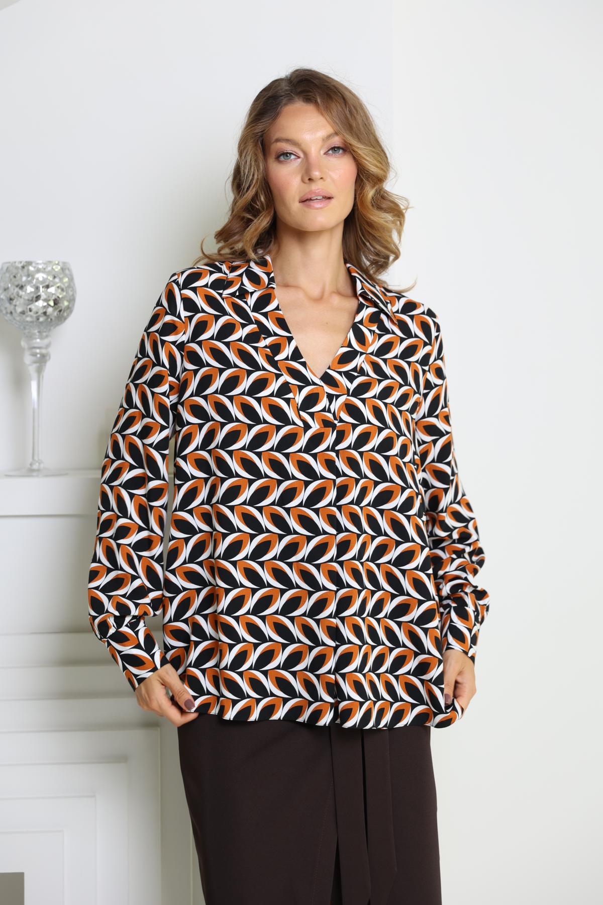 Блузка свободного кроя с отстроченным V-вырезом и отложным воротом. Втачной рукав с широкой манжетой. Складка по переду изделия.