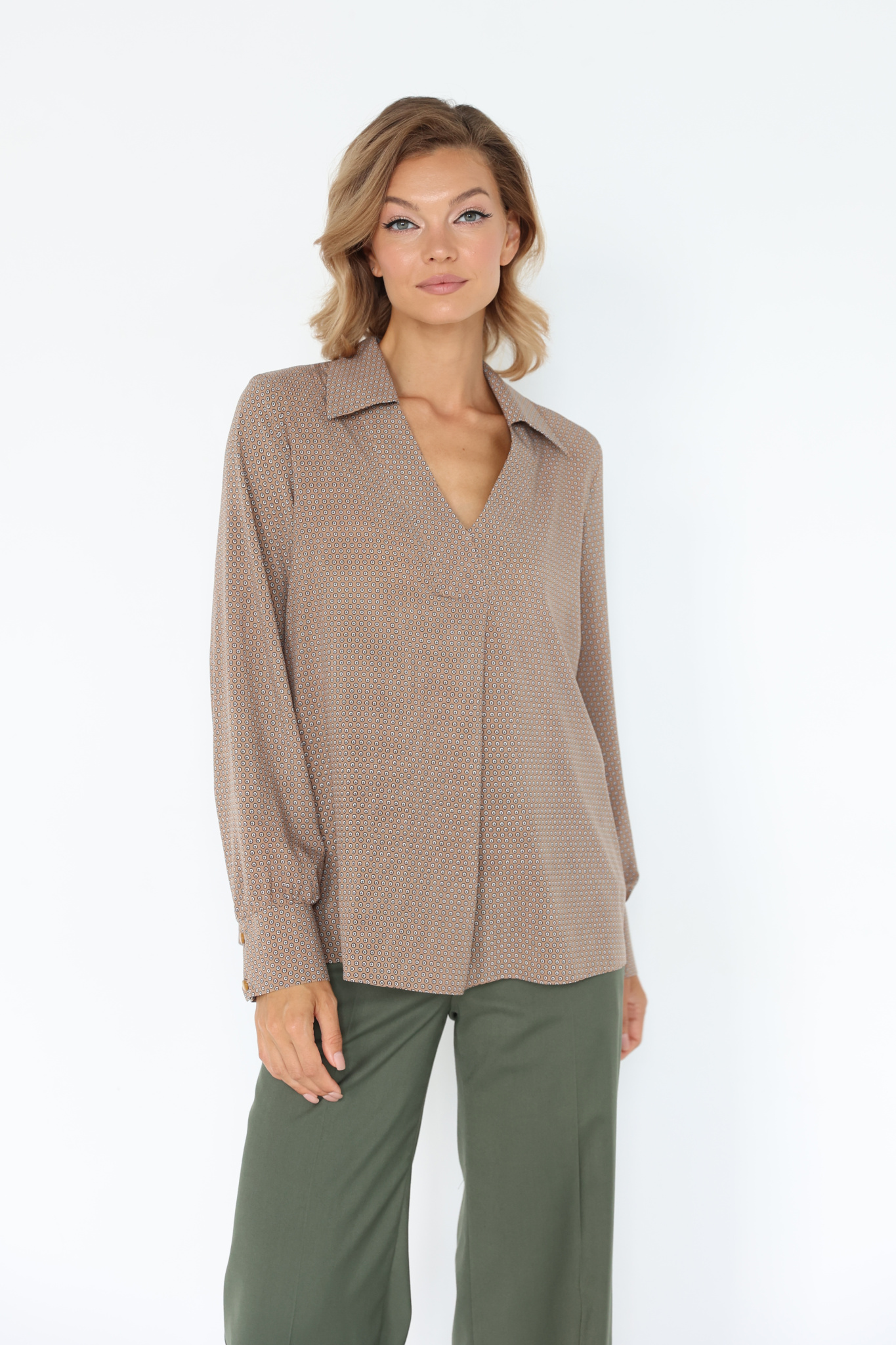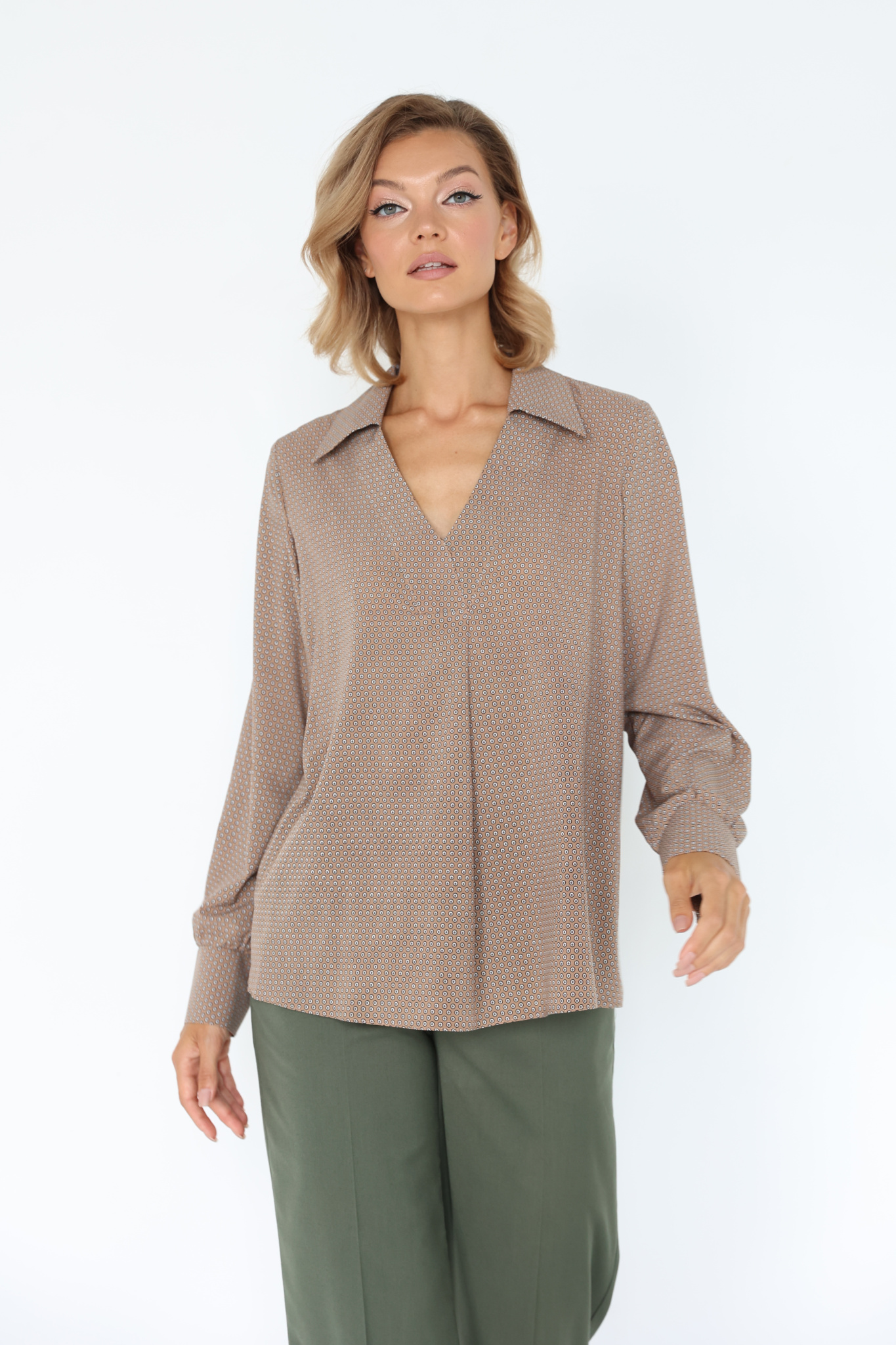 Блузка свободного кроя с отстроченным V-вырезом и отложным воротом. Втачной рукав с широкой манжетой. Складка по переду изделия.