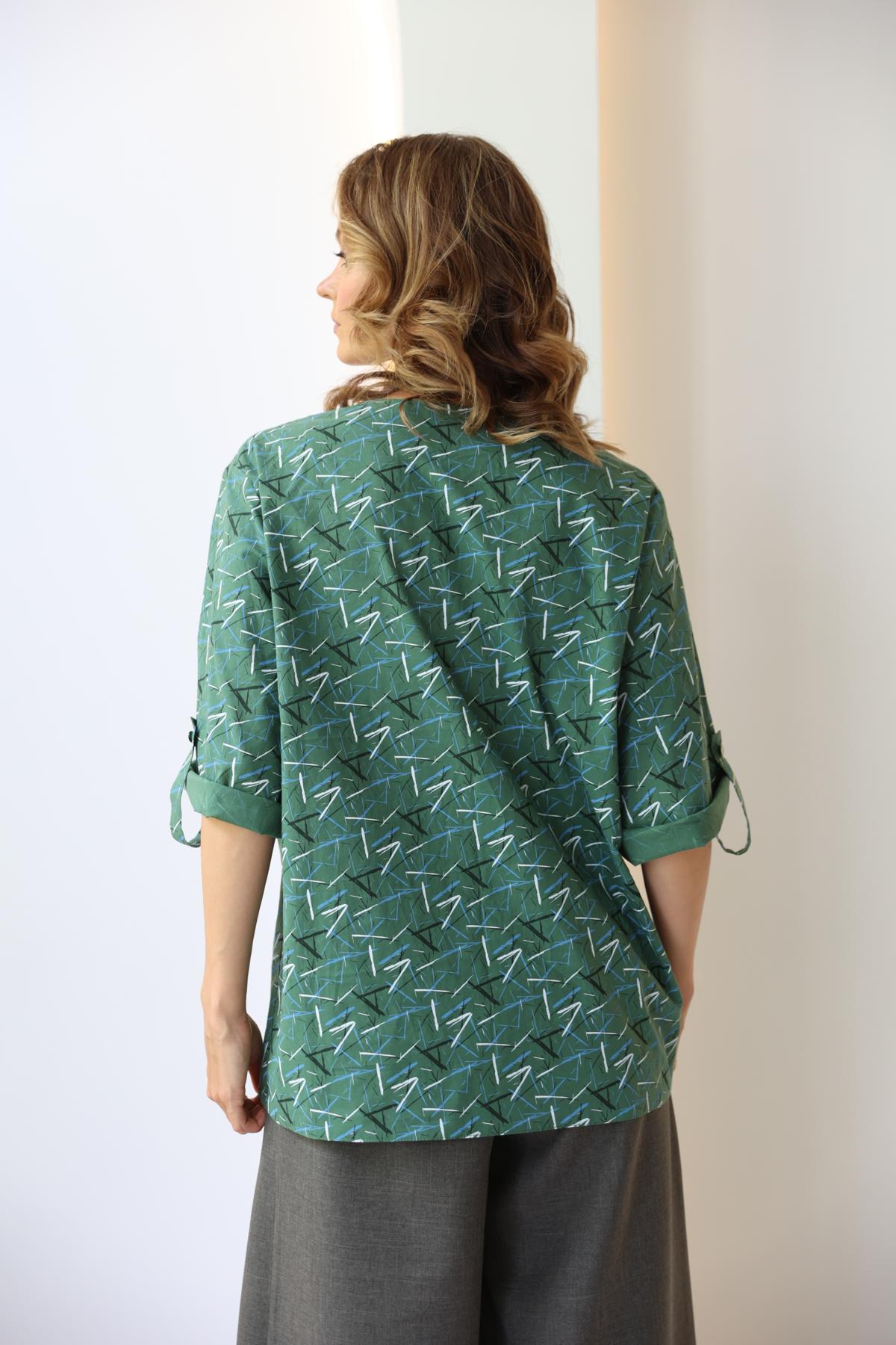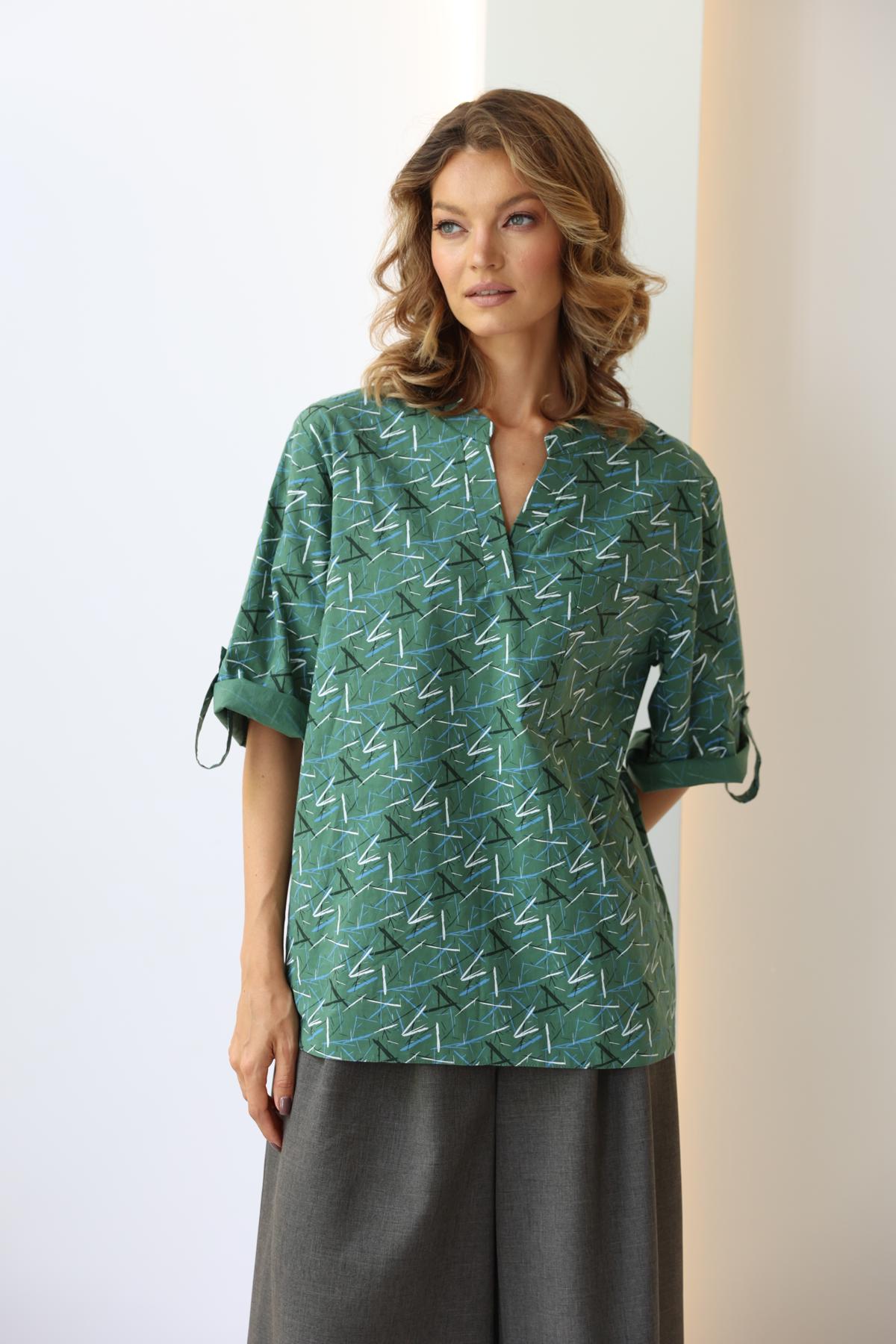 Блузка свободного кроя с V-образной горловиной. Рукава типа «кимоно» с патами, регулирующими длину. Нагрудный карман.