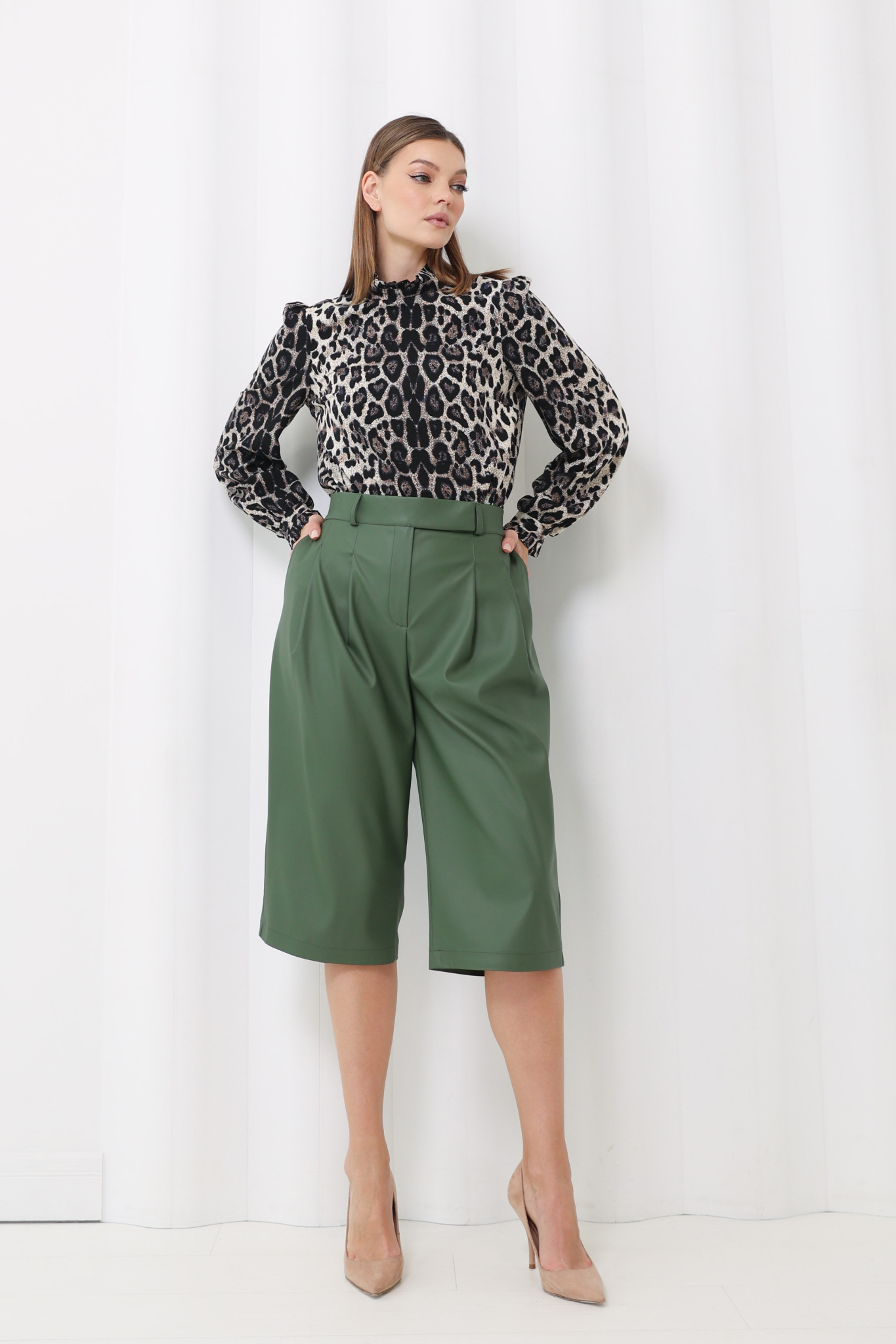 Блузка прямого кроя с воротом стойкой, выполненным в виде рюши. Застёгивается на пуговку на спинке горловины. Манжет втачного рукава так же дополнен рюшей из основной ткани.