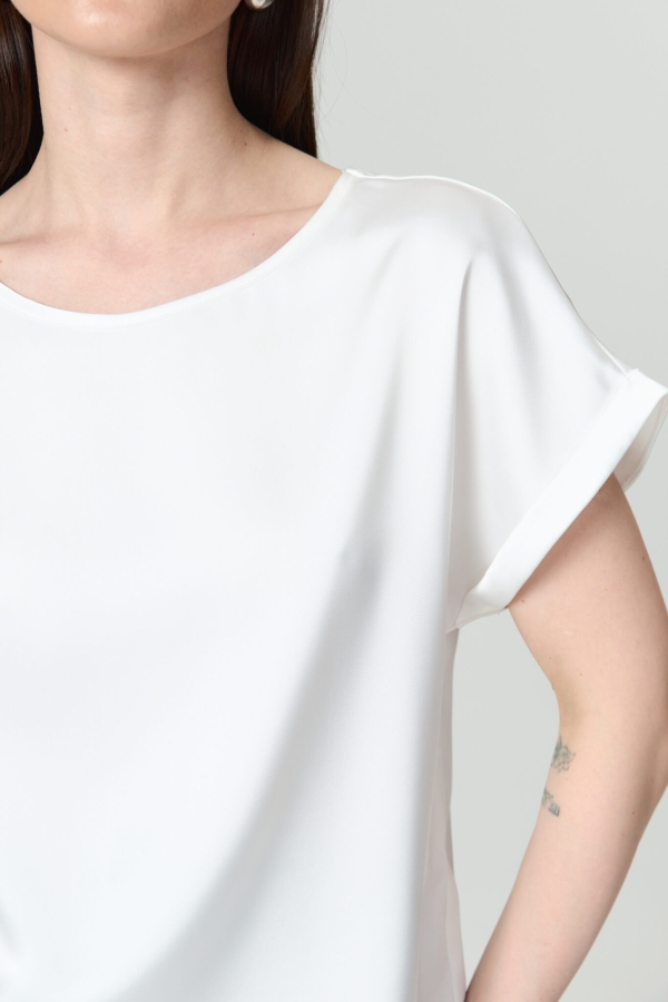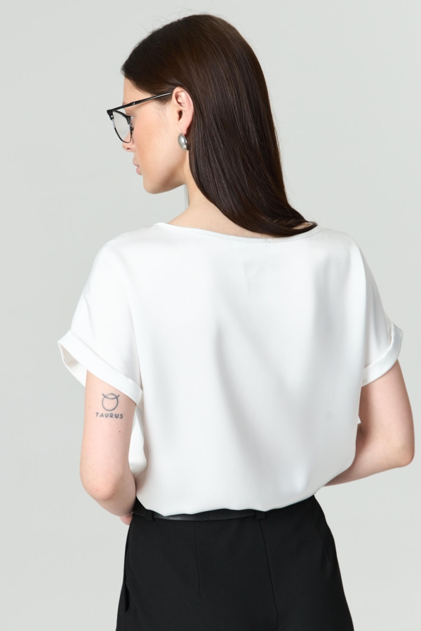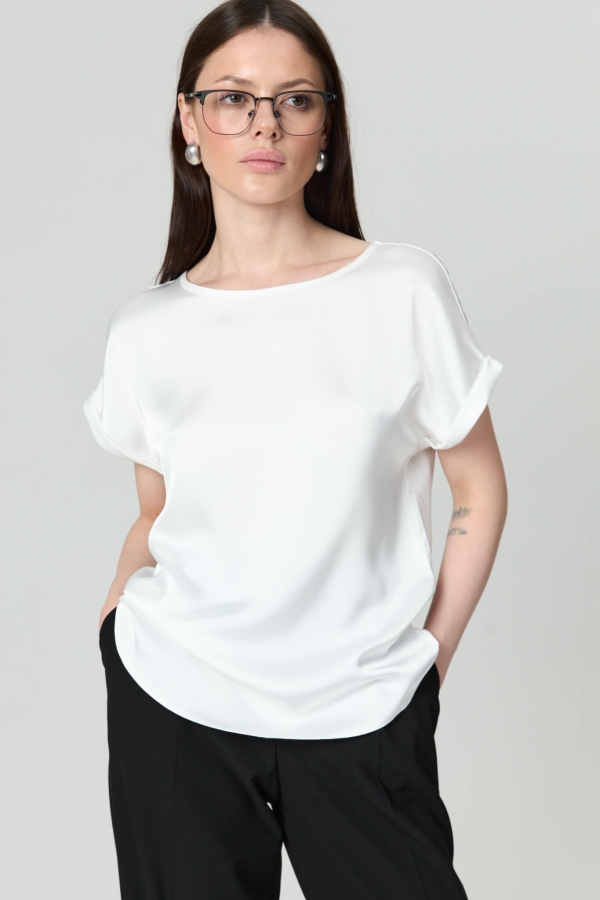 Базовая блуза из атласного полотна высокого качества. Модель прямого силуэта. Спущенное плечо на манжете. Низ изделия фигурный.