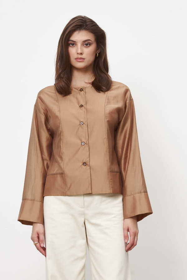 Элегантная блуза из вискозной органзы. Модель свободного силуэта. Спущенная линия плеча. Круглый вырез горловины. Длинный, слегка расклешенный рукав. Застежка на пуговицы.