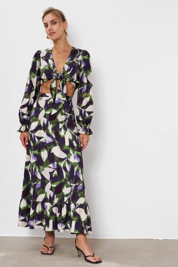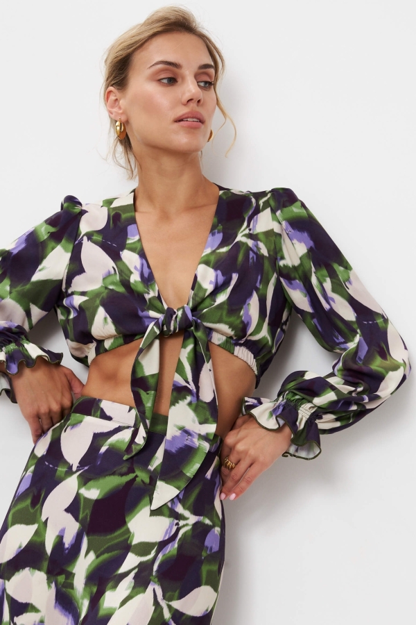 Блуза из высококачественного вискозного полотна с авторским принтом. Укороченная модель с функциональным узлом по переду. Рукав-фонарик со сборкой на резинке.