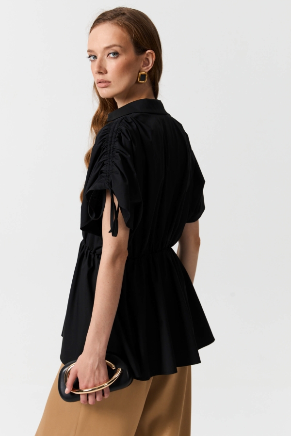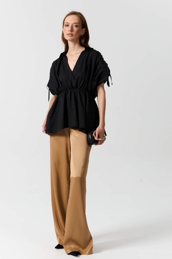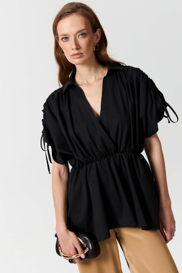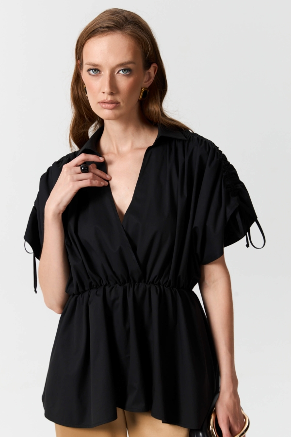 Эффектная блуза из плотного хлопка. Модель полуприлегающего силуэта с имитацией запаха. Линия талии укреплена эластичной резиной.
