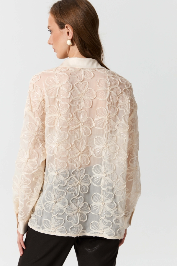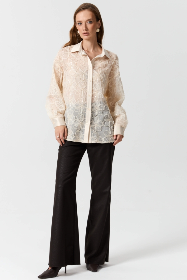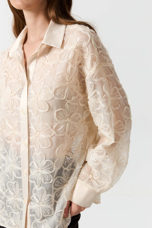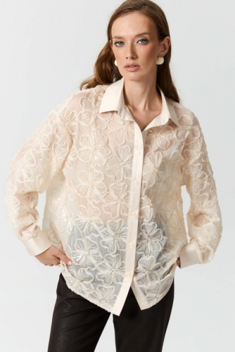 Эффектная блуза из шифона с объемными цветами и пайетками. Модель свободного силуэта. Рукав спущенный с манжетой на петлю и пуговицу. По переду застежка на петли и пуговицы. Воротник, планка и манжеты выполнены из атласа - компаньона.