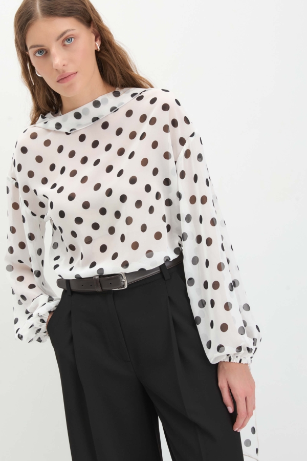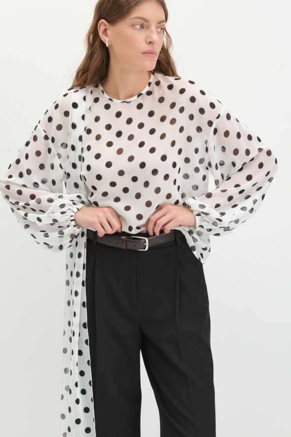 Романтичная блуза из креп-шифона с принтом polka dot. Модель прямого силуэта, рукав объемный со сборкой на резинку. В плечевом шве двойной декоративный шарф для разных стилизаций.