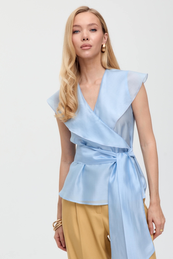 Блуза из воздушного тенселя нежно-голубого оттенка. Модель прилегающего силуэта на запах. Воротник акцентный, шалевый. Низ изделия ассиметричный. В комплекте широкий пояс из основного материала.