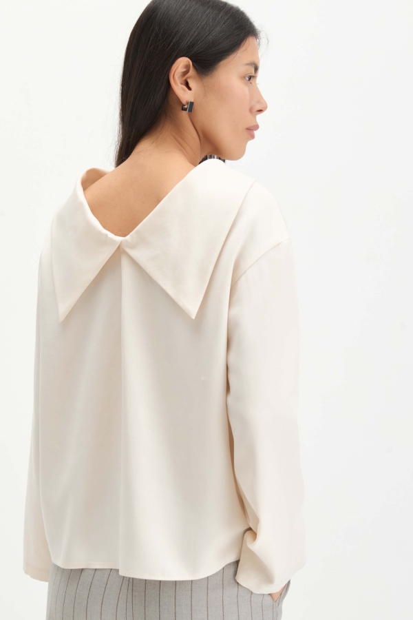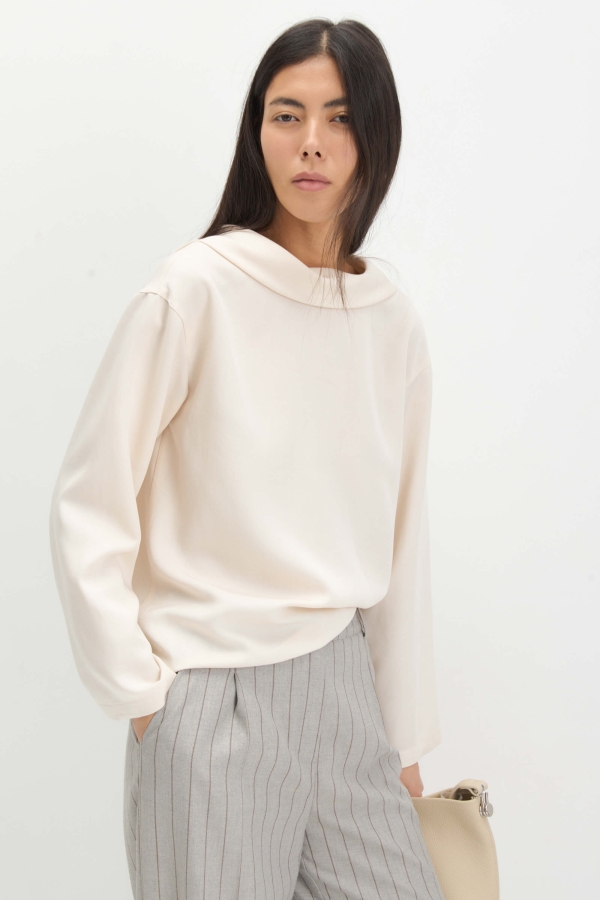Блуза из лиоцелла в нежном оттенке. Модель прямого, слегка свободного силуэта. Рукав спущенный, свободный. По переду горловина оформлена мягким “шалевым” воротом переходящим в декоративный вырез по спинке.