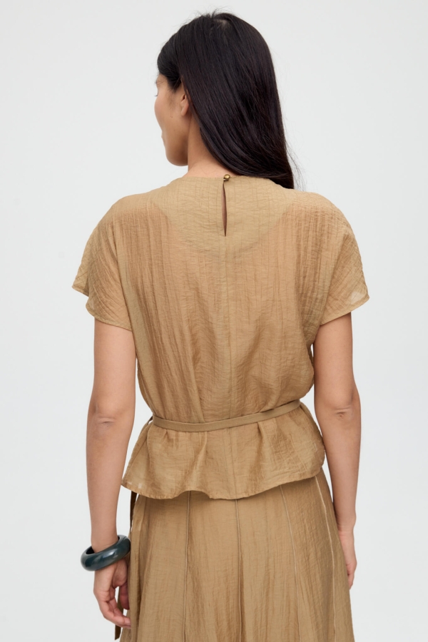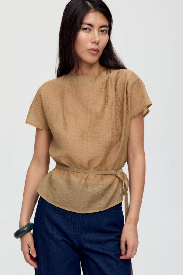 Топ из фактурной вискозы в благородном оттенке. Модель прямого силуэта, рукав спущенный. По плечевому шву ассиметричные складки. В комплекте тонкий пояс с фиксацией на металлические полукольца.