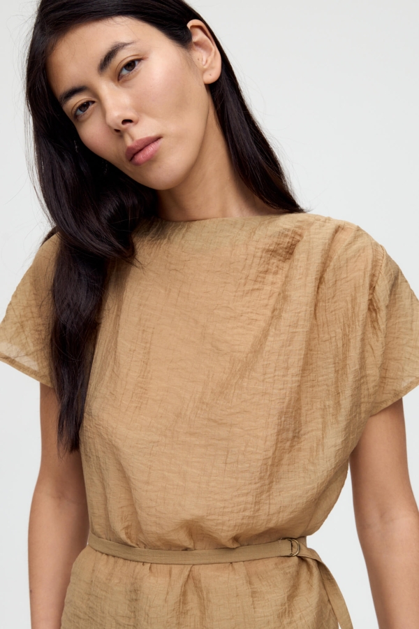 Топ из фактурной вискозы в благородном оттенке. Модель прямого силуэта, рукав спущенный. По плечевому шву ассиметричные складки. В комплекте тонкий пояс с фиксацией на металлические полукольца.