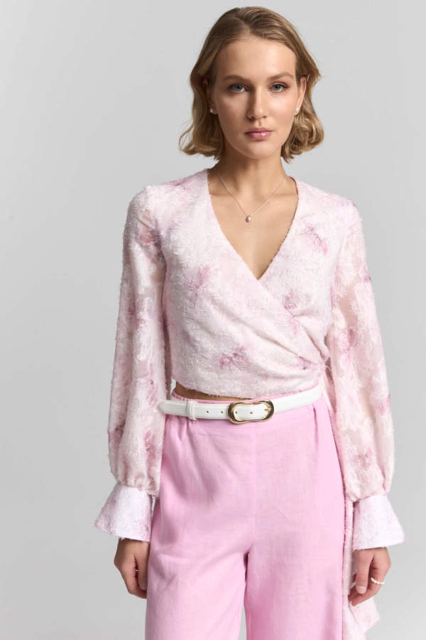 Блуза на запах из воздушного шифона с объемной вышивкой. Модель полуприлегающего силуэта на запах. По переду декоративный шлейф из шарфа. Рукав втачной,объемный по низу собран и фиксируется на манжету с пуговицей. Изделие по переду и спинке на подкладе.