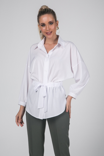 Элегантная блузка приталенного силуэта. Классический рубашечный воротник на стойке переходящий в планку с застежкой на петли и пуговицы. Длинные втачные рукава со спущенным плечом оканчиваются притачной манжетой. Линия талии дополнена кулиской на резинке переходящий в пояс. По бокам низ фигурный, без разрезов.