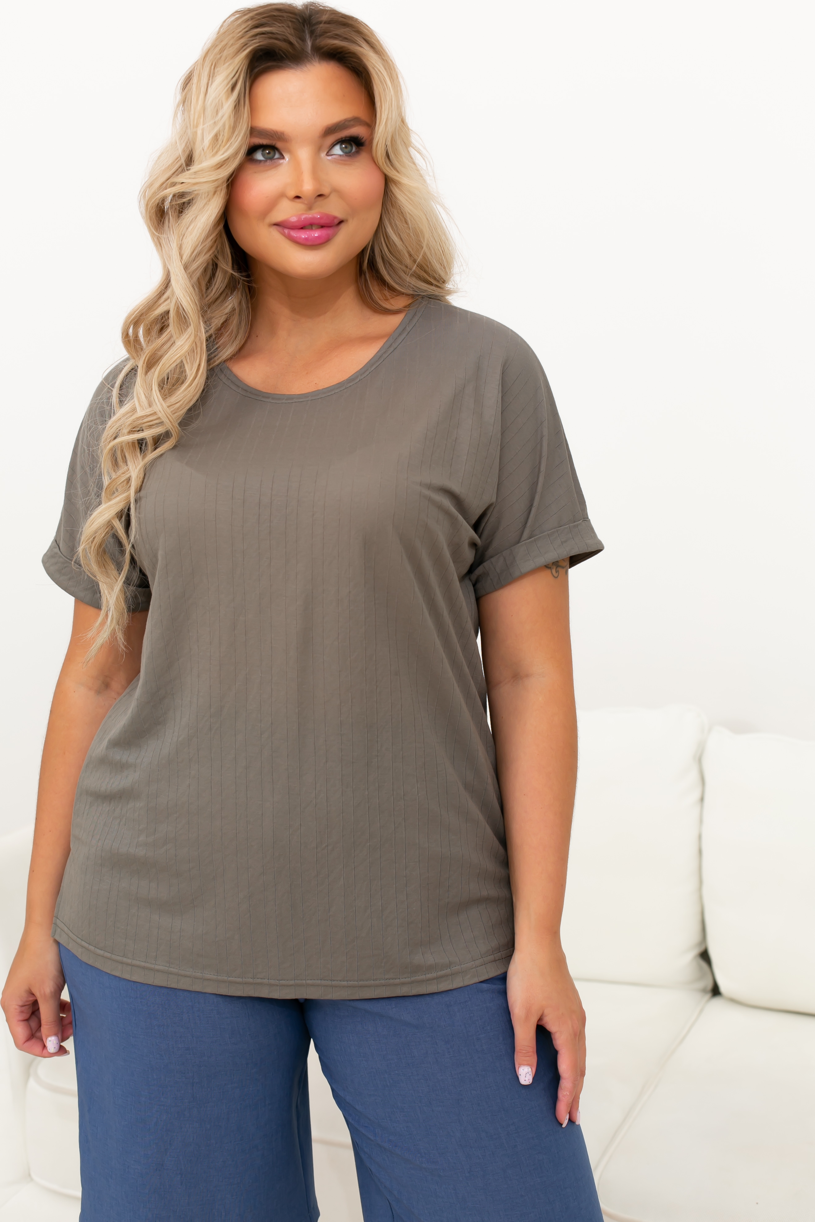 Практичная футболка прямого силуэта из мягкого трикотажа. Короткие цельнокроеные рукава, оканчиваются манжетами на отворотах. Округлый вырез горловины. Низ ровный, по бокам небольшие разрезы. Без застежки. Идеальный вариант на каждый день.