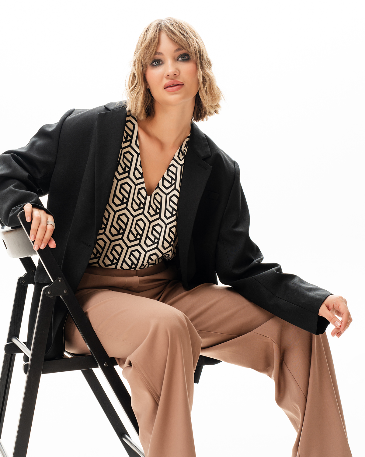 V-образный вырез визуально удлиняет шею. Ткань красиво струится.