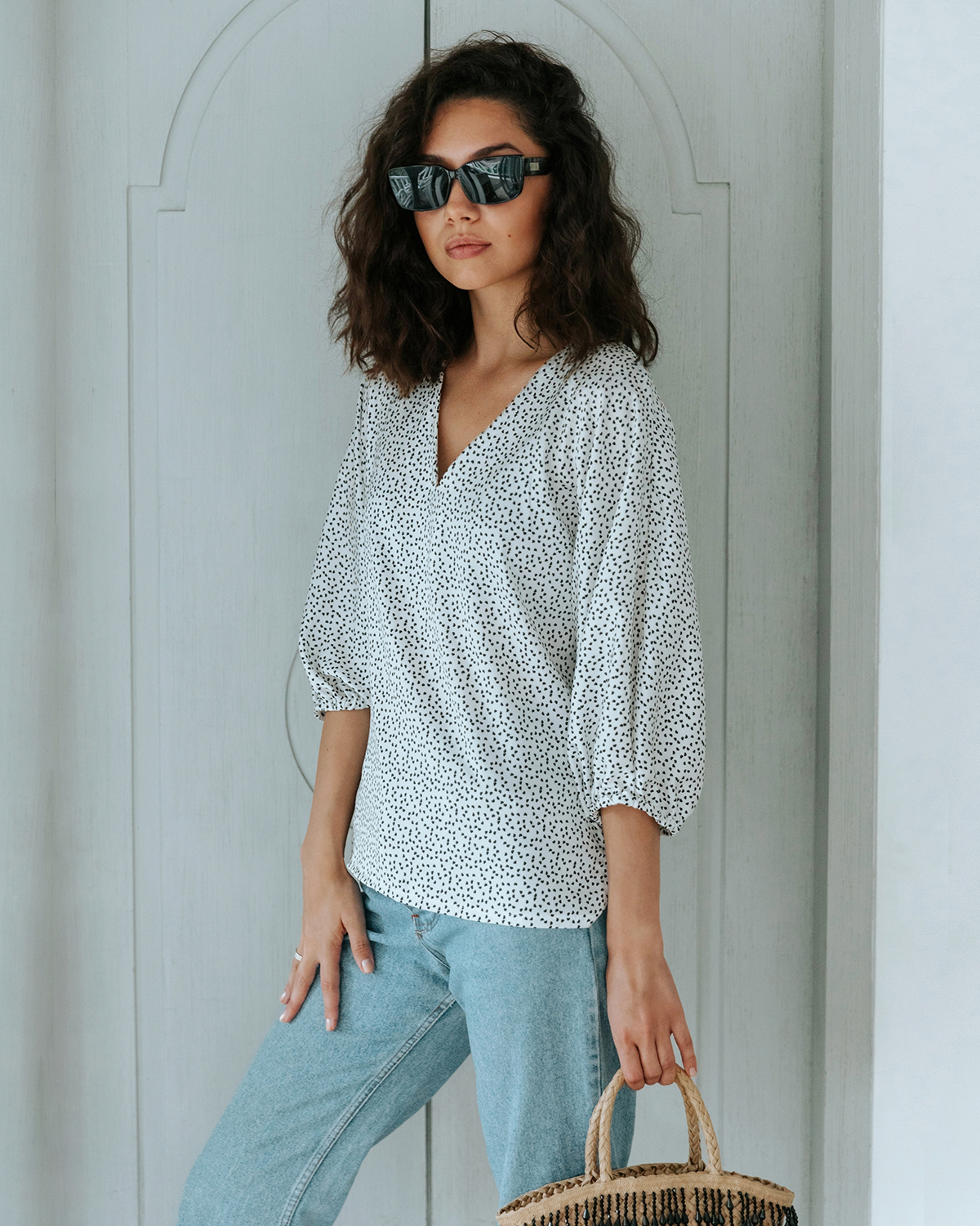 V-образный вырез визуально удлиняет шею. Ткань красиво струится.