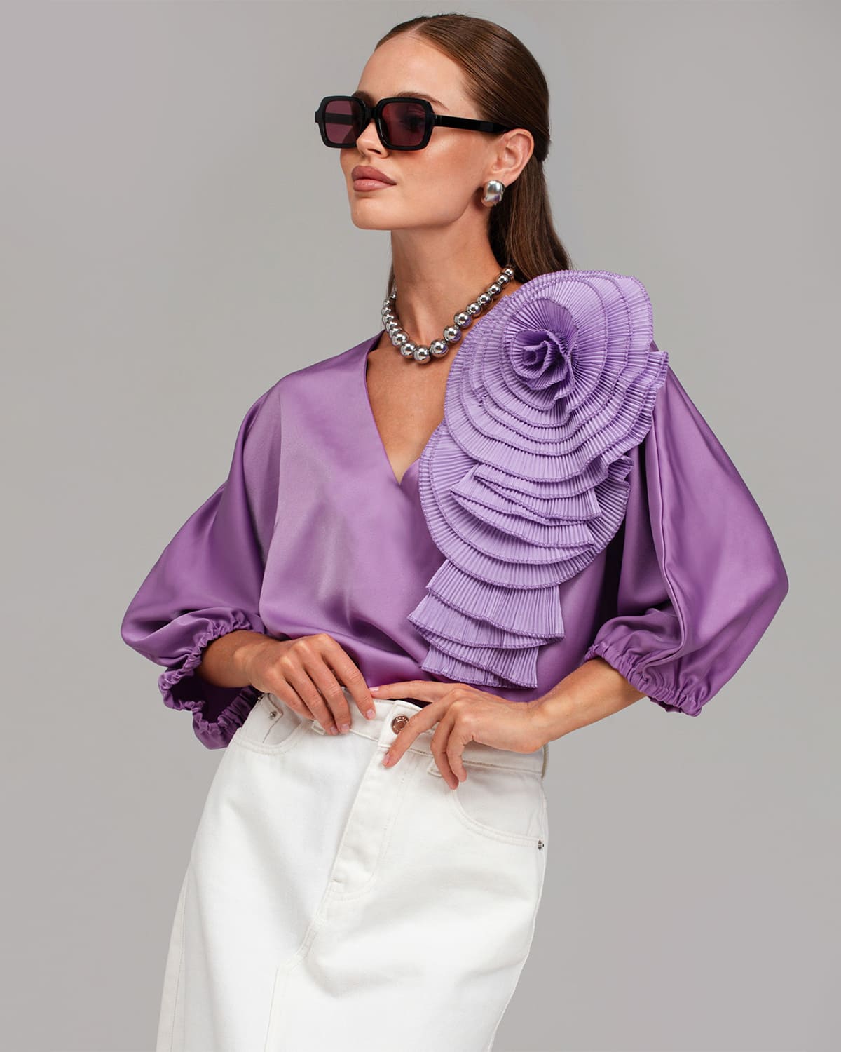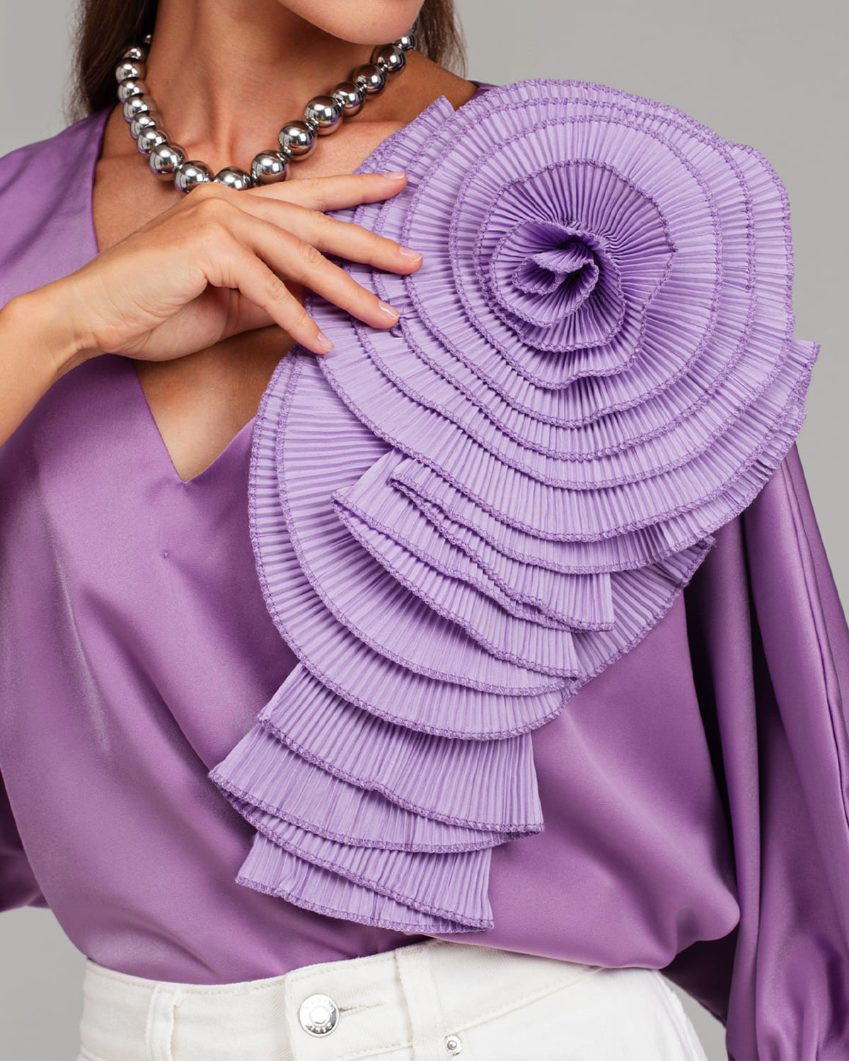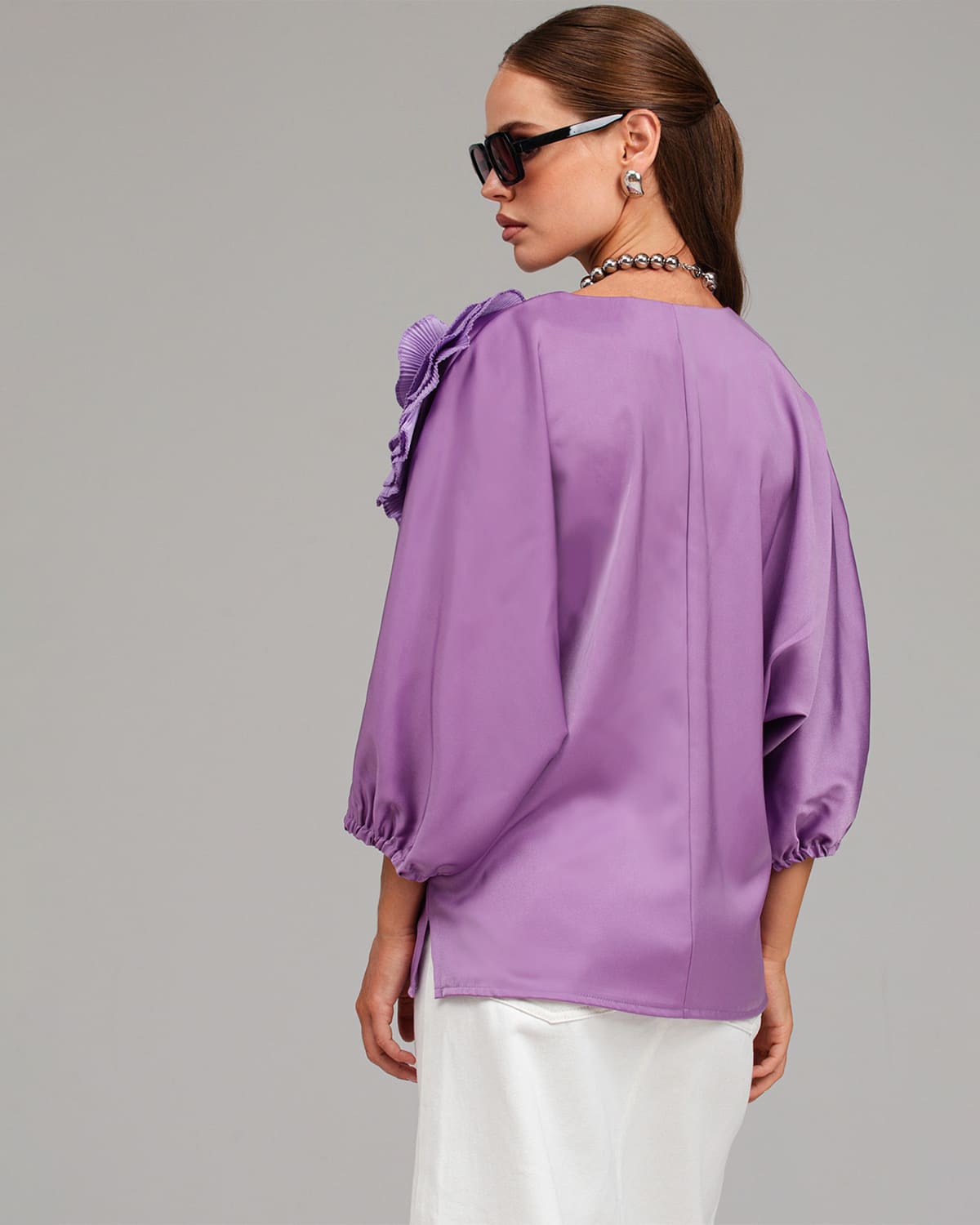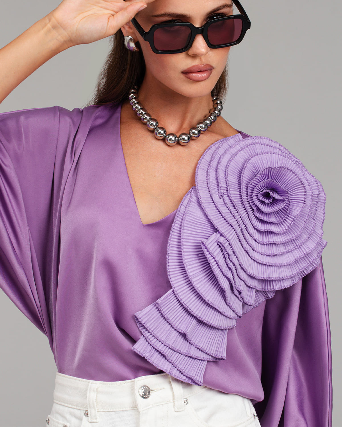 Эта модная шёлковая футболка с декором станет отличным акцентом Вашего гардероба. Женская футболка выполнена из японского шёлка. Материал приятен для тела, лёгкий, хорошо дышит. Модель оверсайз кроя отлично подходит для создания расслабленных образов. Она комфортна из-за свободной посадки и не стесняет движения. Особое внимание заслуживает трендовый декор на плече в форме большого цветка жабо, выполненного из гофрированного хлопка.