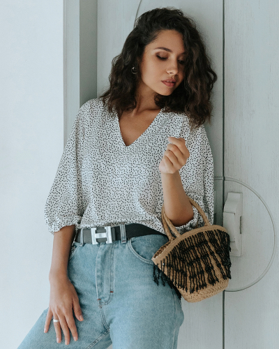 Женская футболка идеально подходит как для повседневных, так и нарядных образов. Декор на плече привлекает внимание и выглядит празднично, придавая вашему образу особый шарм. V-образный вырез визуально удлиняет шею. Ткань красиво струится.