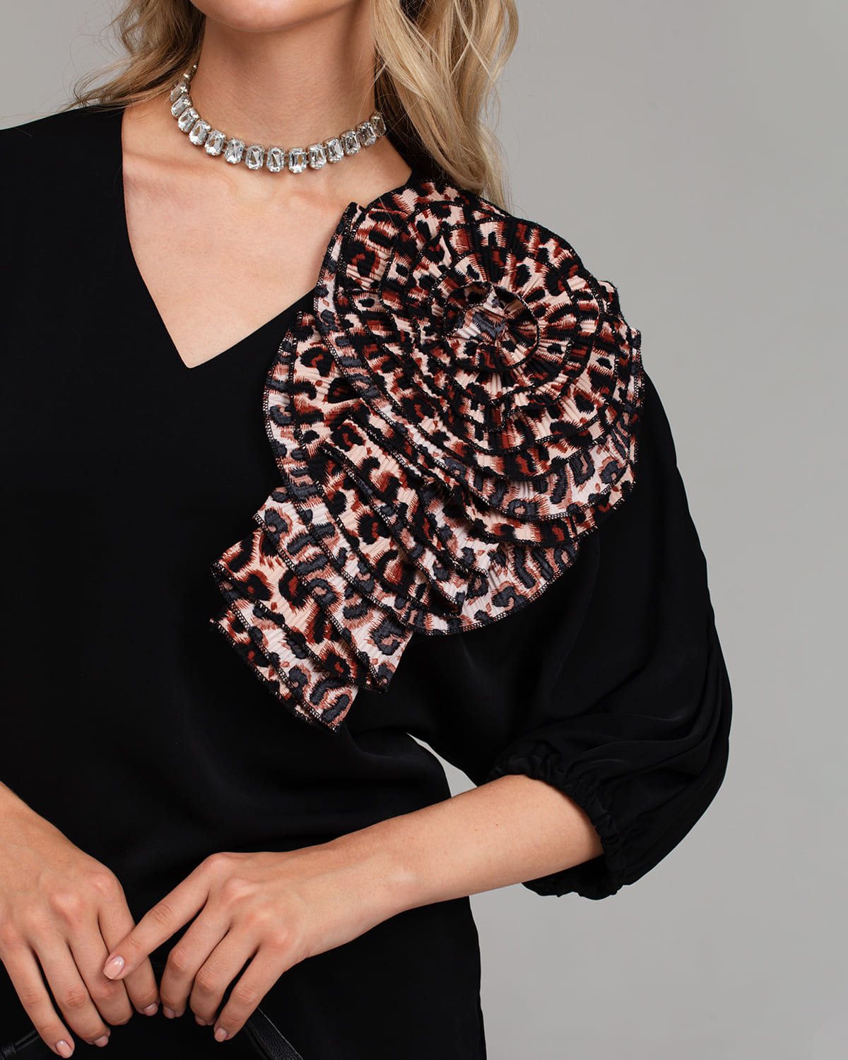 Женская футболка идеально подходит как для повседневных, так и нарядных образов. Декор на плече привлекает внимание и выглядит празднично, придавая вашему образу особый шарм. V-образный вырез визуально удлиняет шею. Ткань красиво струится.