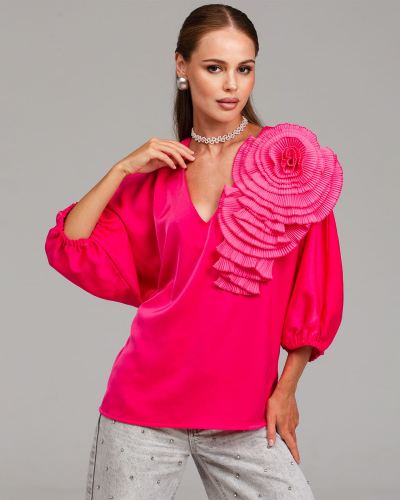 Эта модная шёлковая футболка с декором станет отличным акцентом Вашего гардероба. Женская футболка выполнена из японского шёлка. Материал приятен для тела, лёгкий, хорошо дышит. Модель оверсайз кроя отлично подходит для создания расслабленных образов. Она комфортна из-за свободной посадки и не стесняет движения. Особое внимание заслуживает трендовый декор на плече в форме большого цветка жабо, выполненного из гофрированного хлопка.