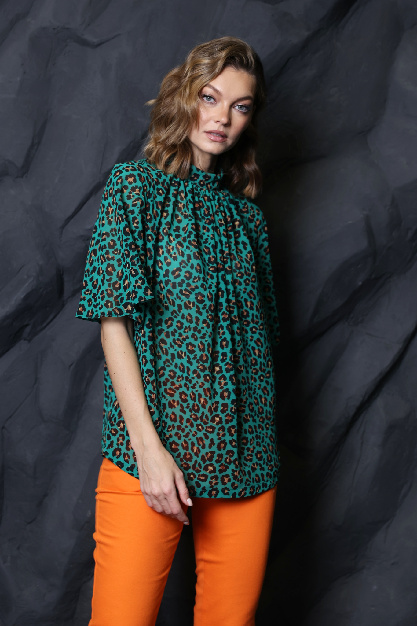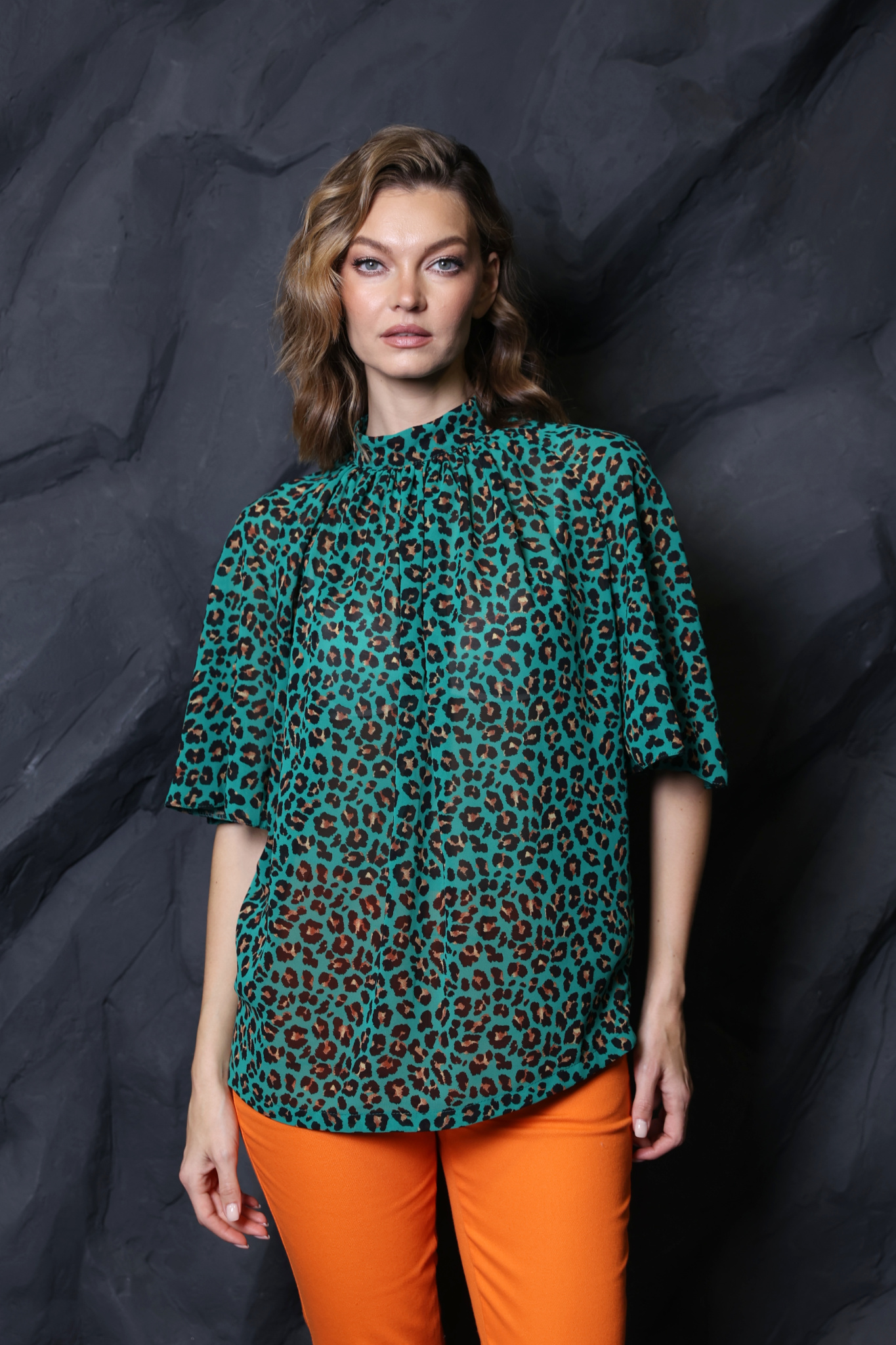 Блузка с рукавом реглан. Рукав пышный средней длины. Воротник стойка с застежкой на 2 пуговицы. Сборка от воротника по переду.