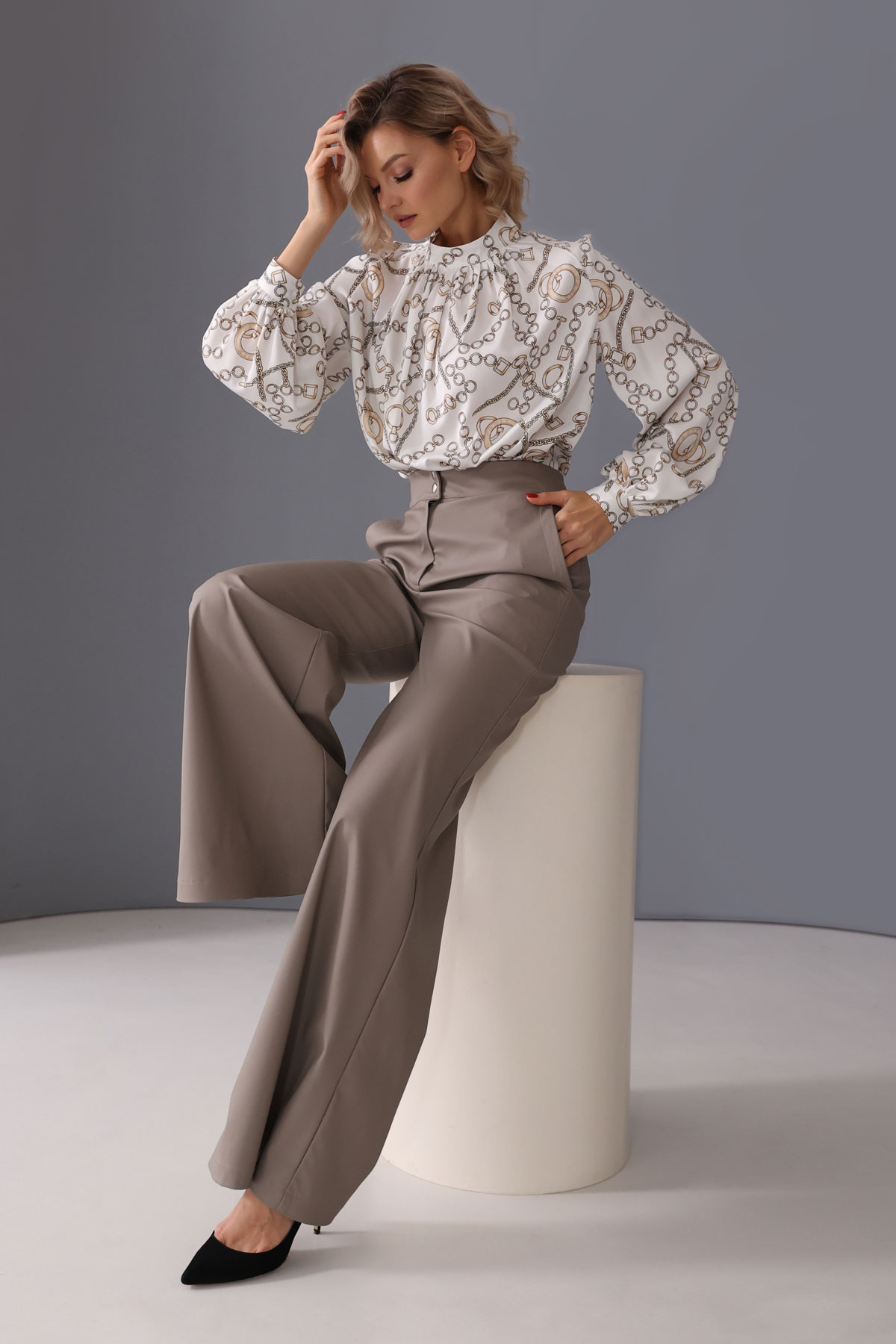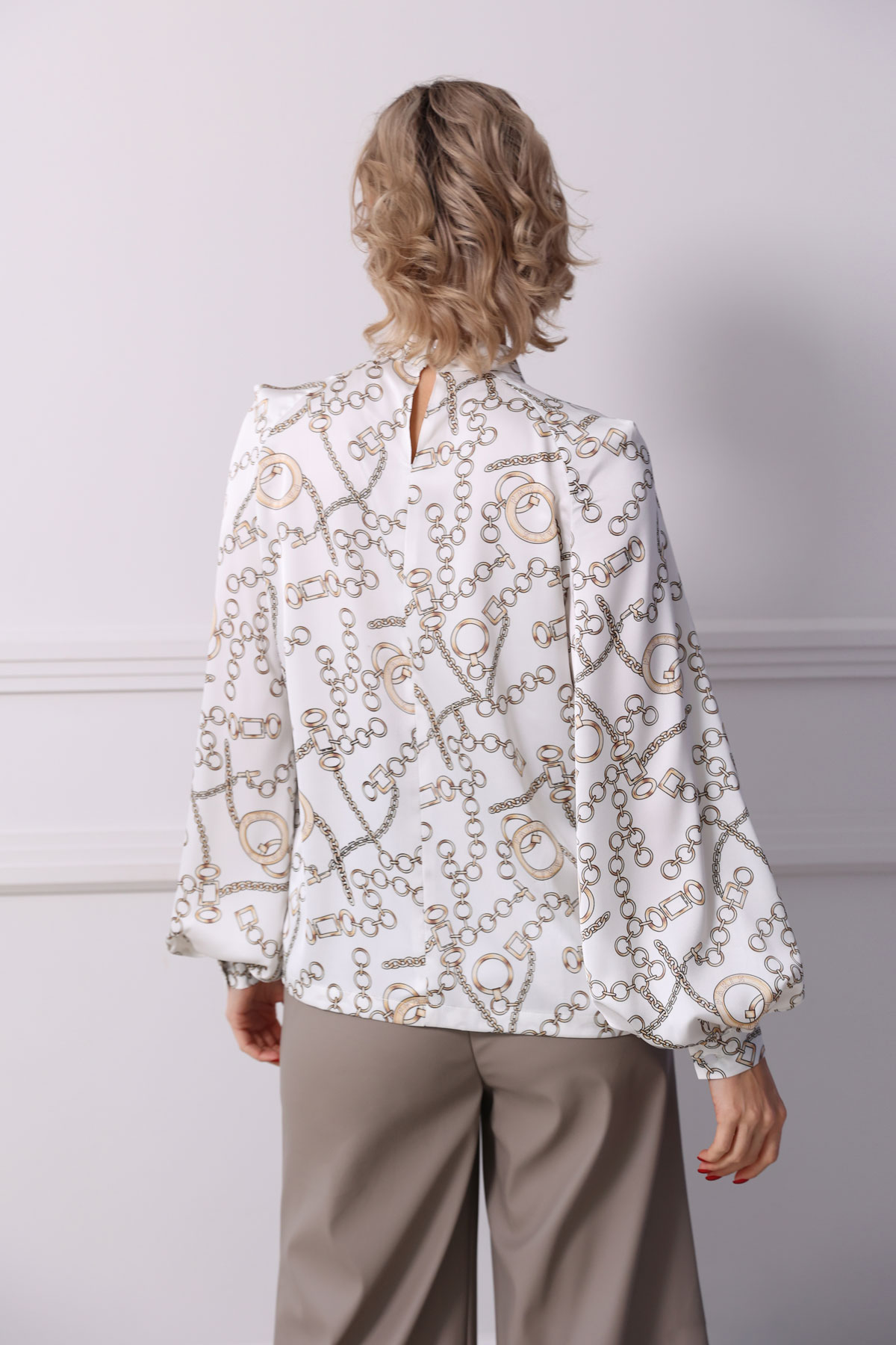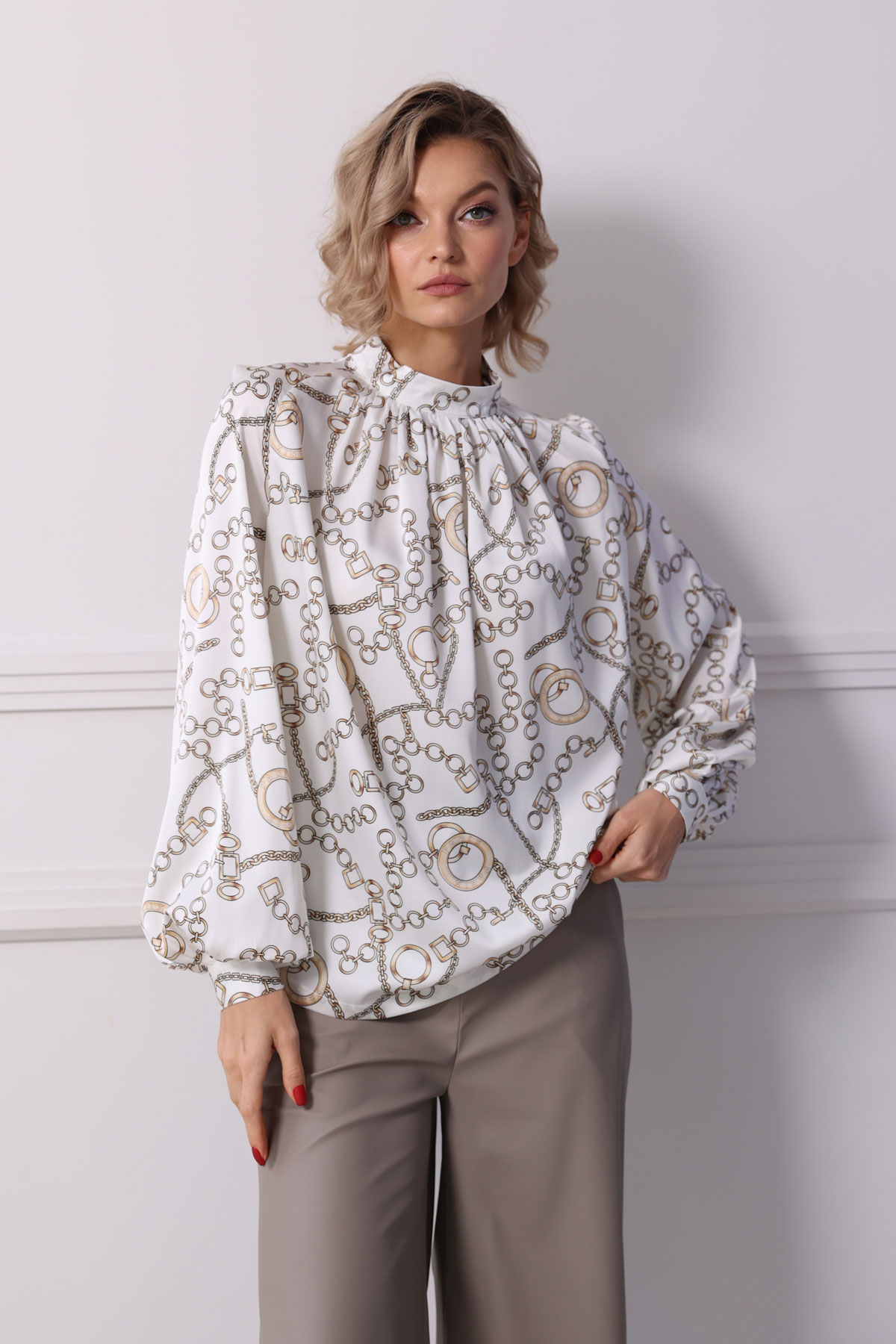 Блузка с рукавом реглан и манжетой на пуговице. Воротник стойка с застежкой на 2 пуговицы. Сборка от воротника по переду.