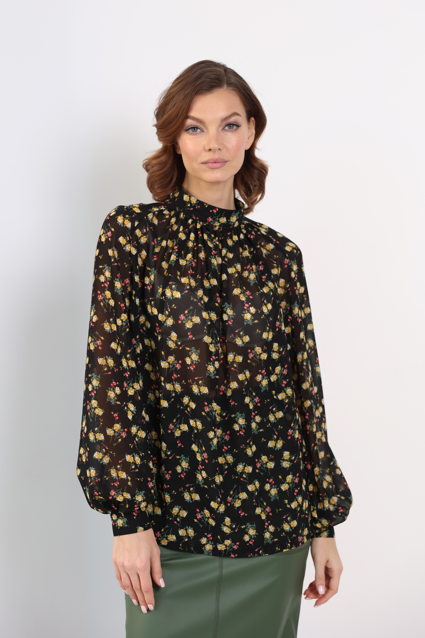 Блузка с рукавом реглан и манжетой на пуговице. Воротник стойка с застежкой на 2 пуговицы. Сборка от воротника по переду.