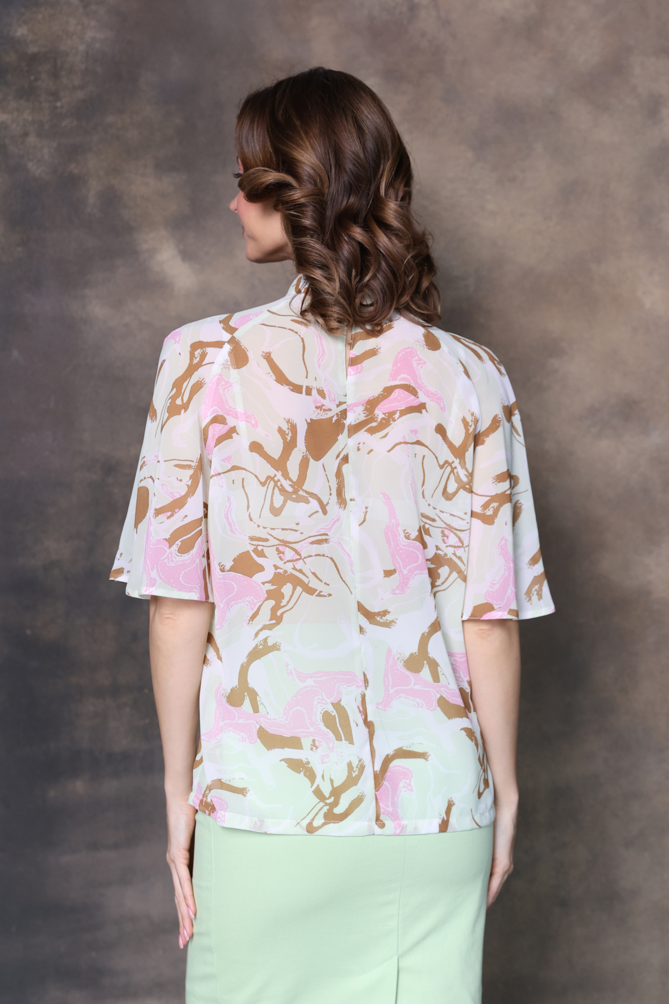Блузка с рукавом реглан. Рукав пышный средней длины. Воротник стойка с застежкой на 2 пуговицы. Сборка от воротника по переду.