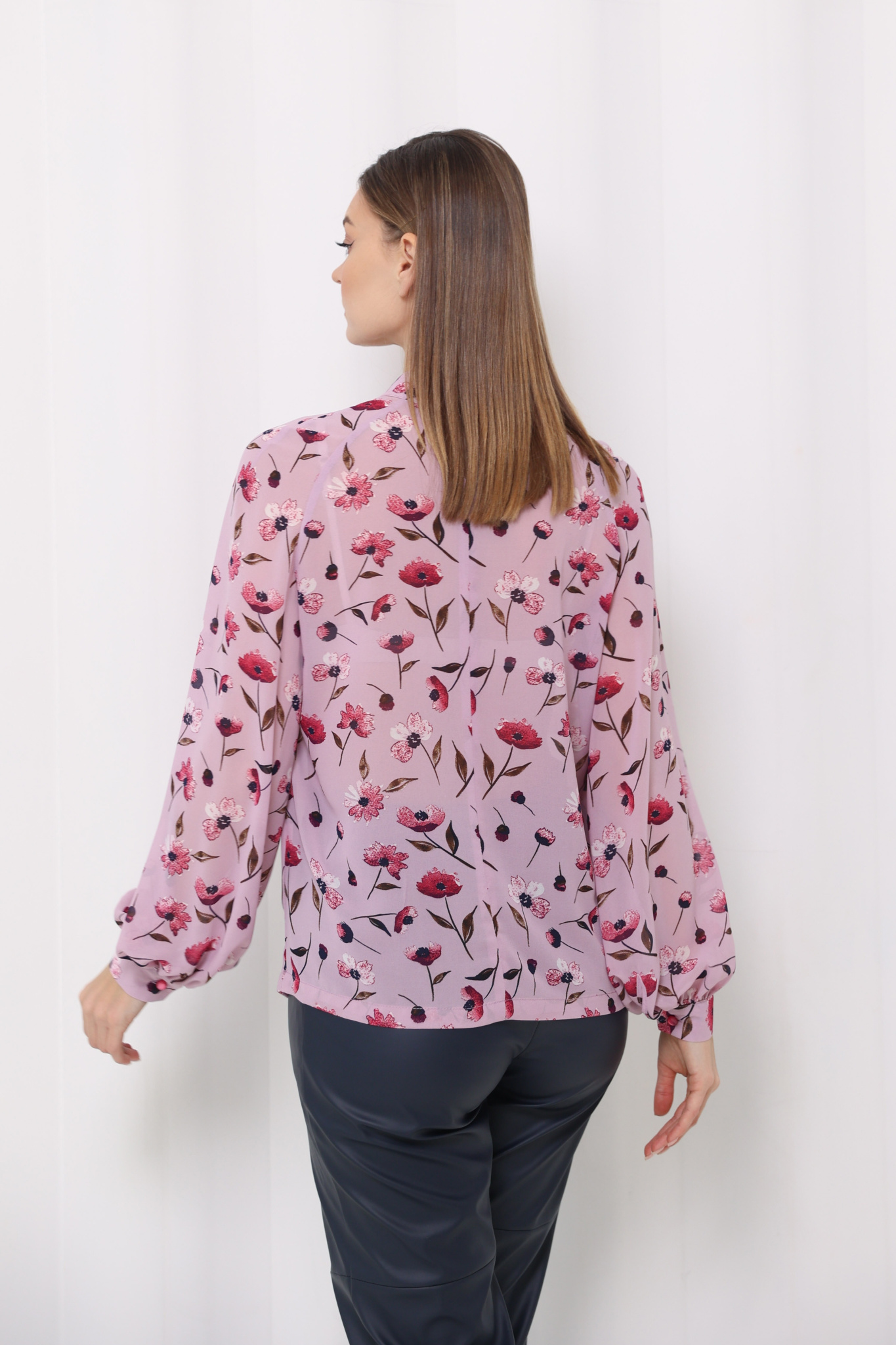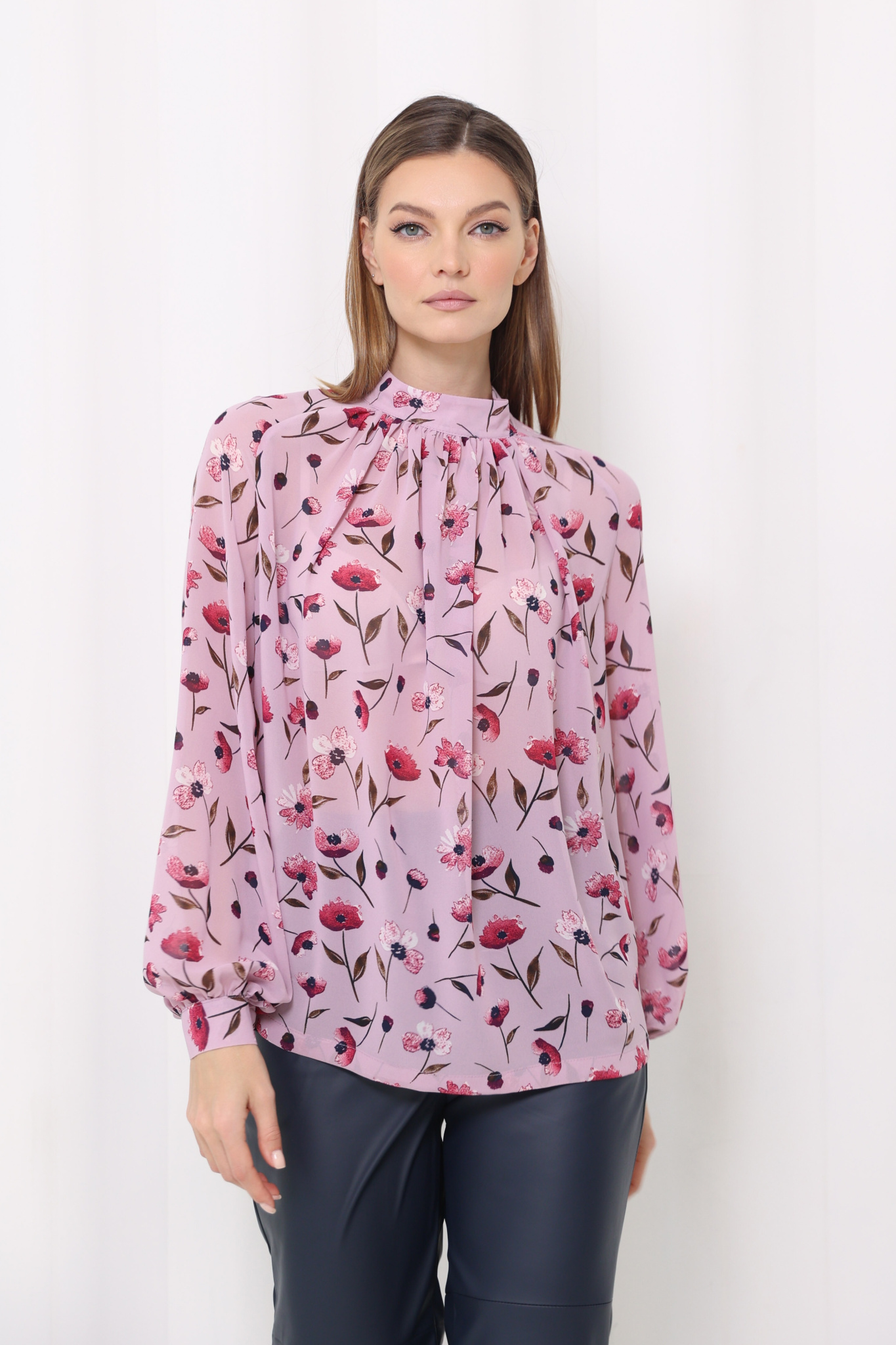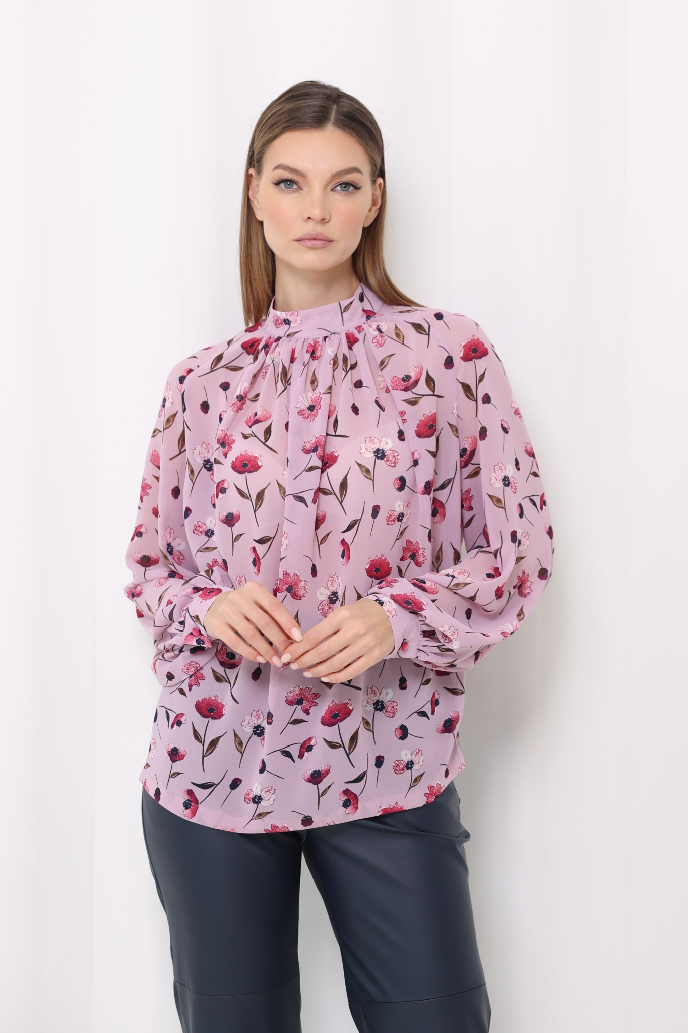 Блузка с рукавом реглан и манжетой на пуговице. Воротник стойка с застёжкой на 2 пуговицы. Сборка от воротника по переду.