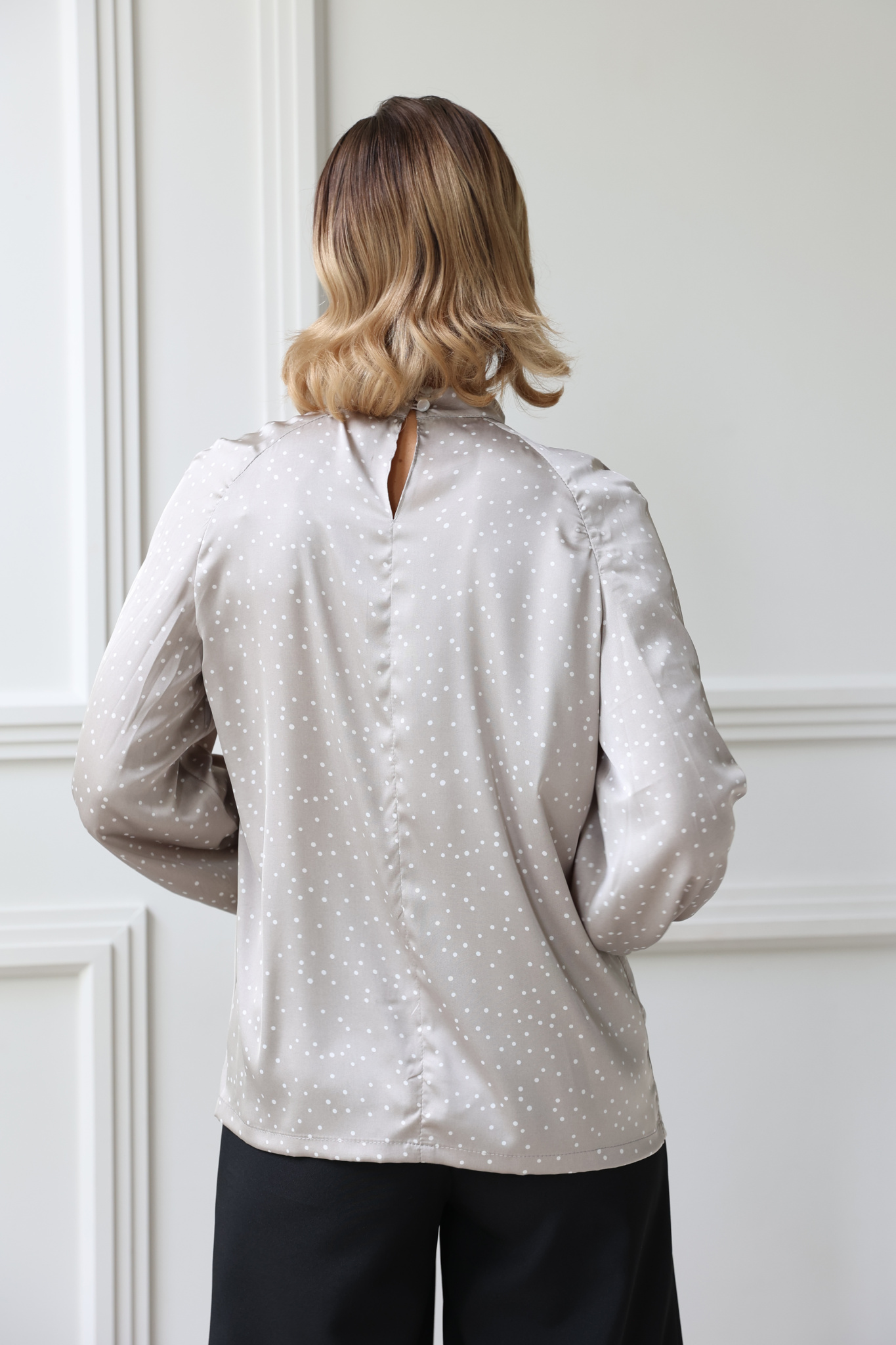 Блузка с рукавом реглан и манжетой на пуговице. Воротник стойка с застежкой на 2 пуговицы. Сборка от воротника по переду.