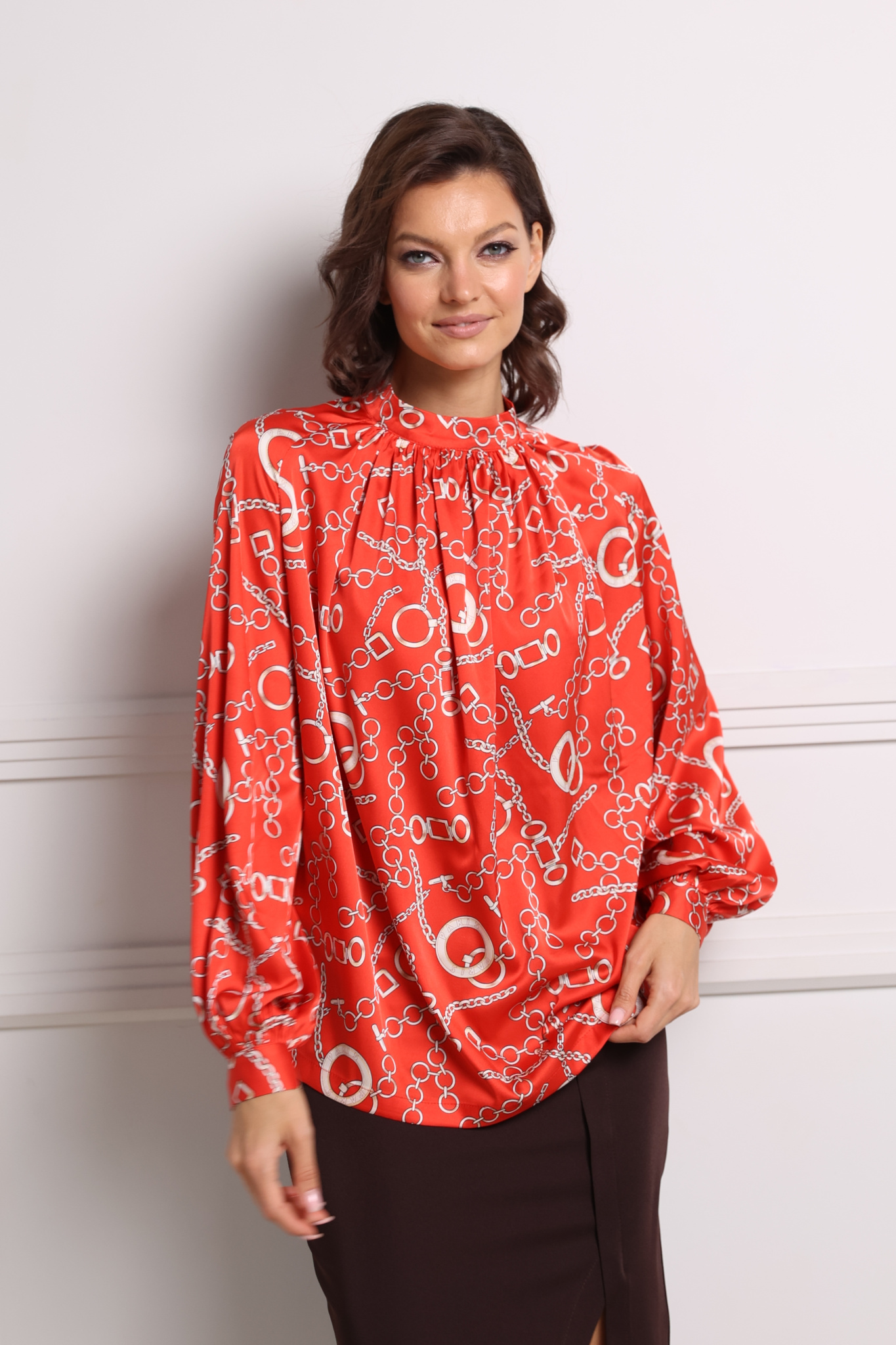 Блузка с рукавом реглан и манжетой на пуговице. Воротник стойка с застежкой на 2 пуговицы. Сборка от воротника по переду.