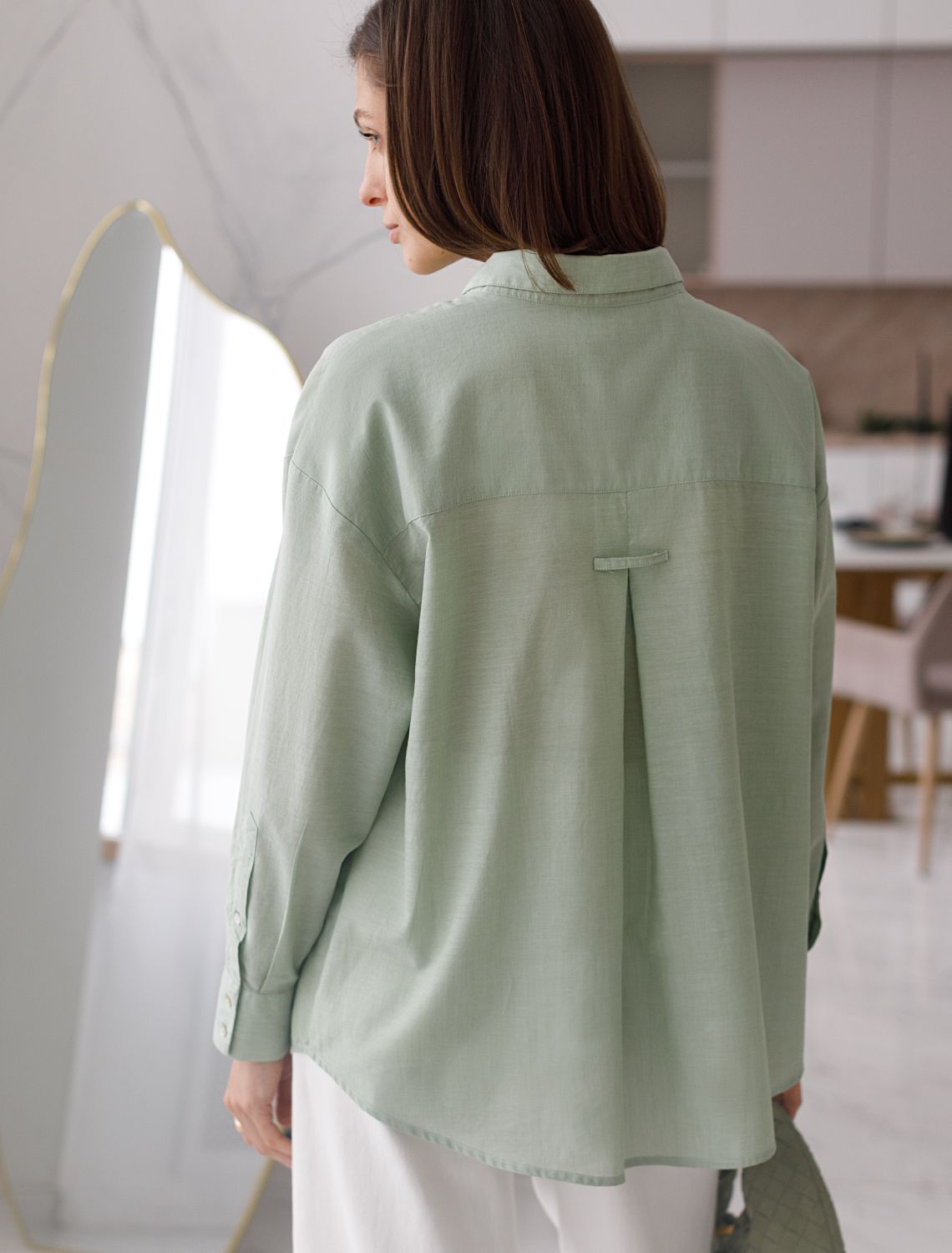 Свободная блузка светло-оливкового цвета с отложным воротником из хлопка станет отличным выбором для тех, кто ценит комфорт и стиль. Благодаря натуральной ткани, блузка приятная к телу и подходит для ежедневной носки. Материал — 100% хлопок — гарантирует хорошую воздухопроницаемость и ощущение свежести даже в жаркие дни. Удлиненный крой создает современный силуэт, который отлично смотрится в повседневных образах. Базовая модель легко впишется в любой гардероб и станет универсальным решением для самых разных случаев.Ткань держит форму после стирки, что делает уход за вещью простым и удобным. Карман на груди добавляет функциональности и делает образ более интересным. Натуральная структура материала не раздражает кожу, а сама блузка освежает внешний вид благодаря своему лаконичному дизайну и приятной расцветке.