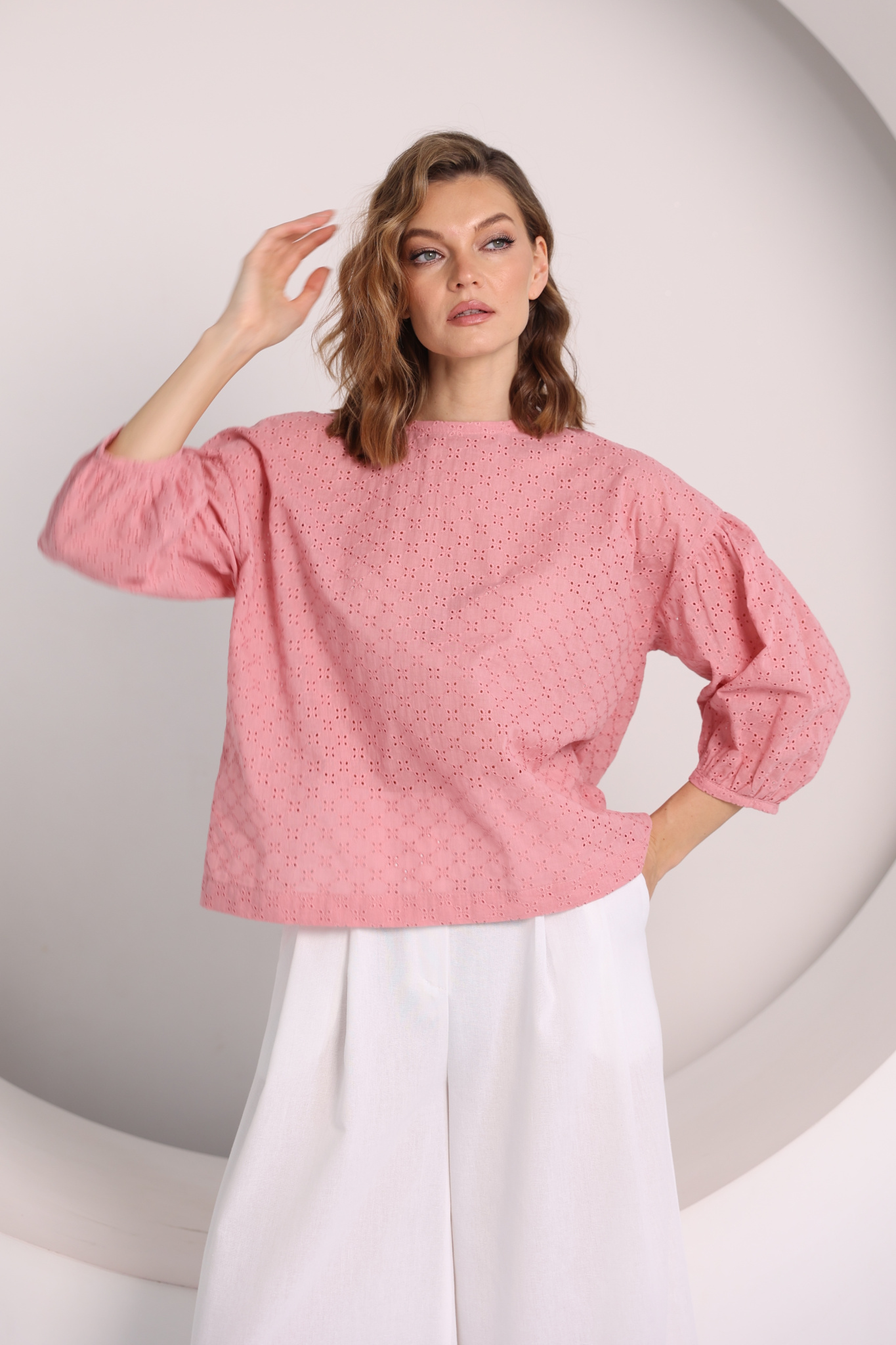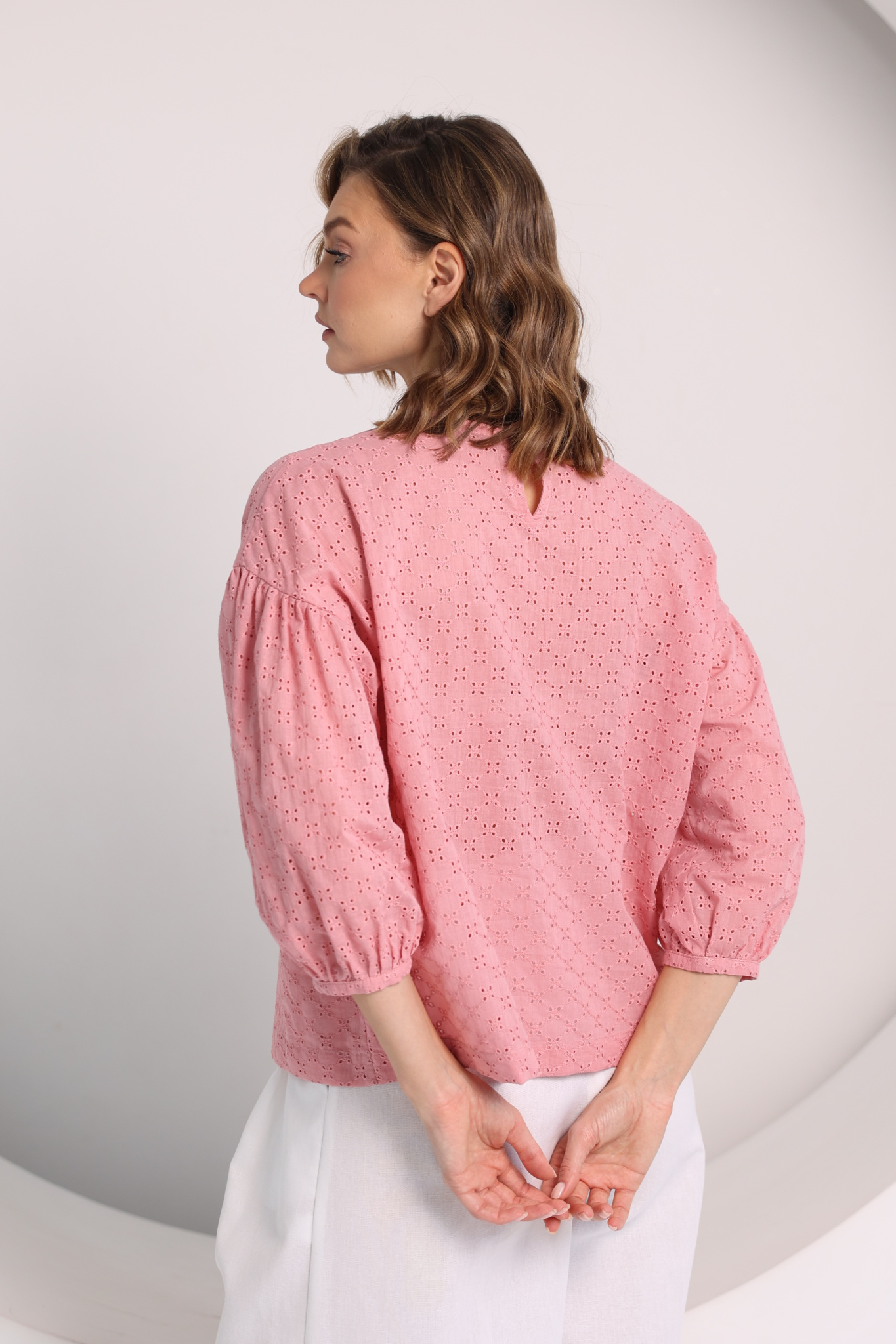 Блузка свободного кроя. Объёмный рукав длиной ¾ со спущенной линией плеча. Застёжка на пуговицу по спинке горловины.