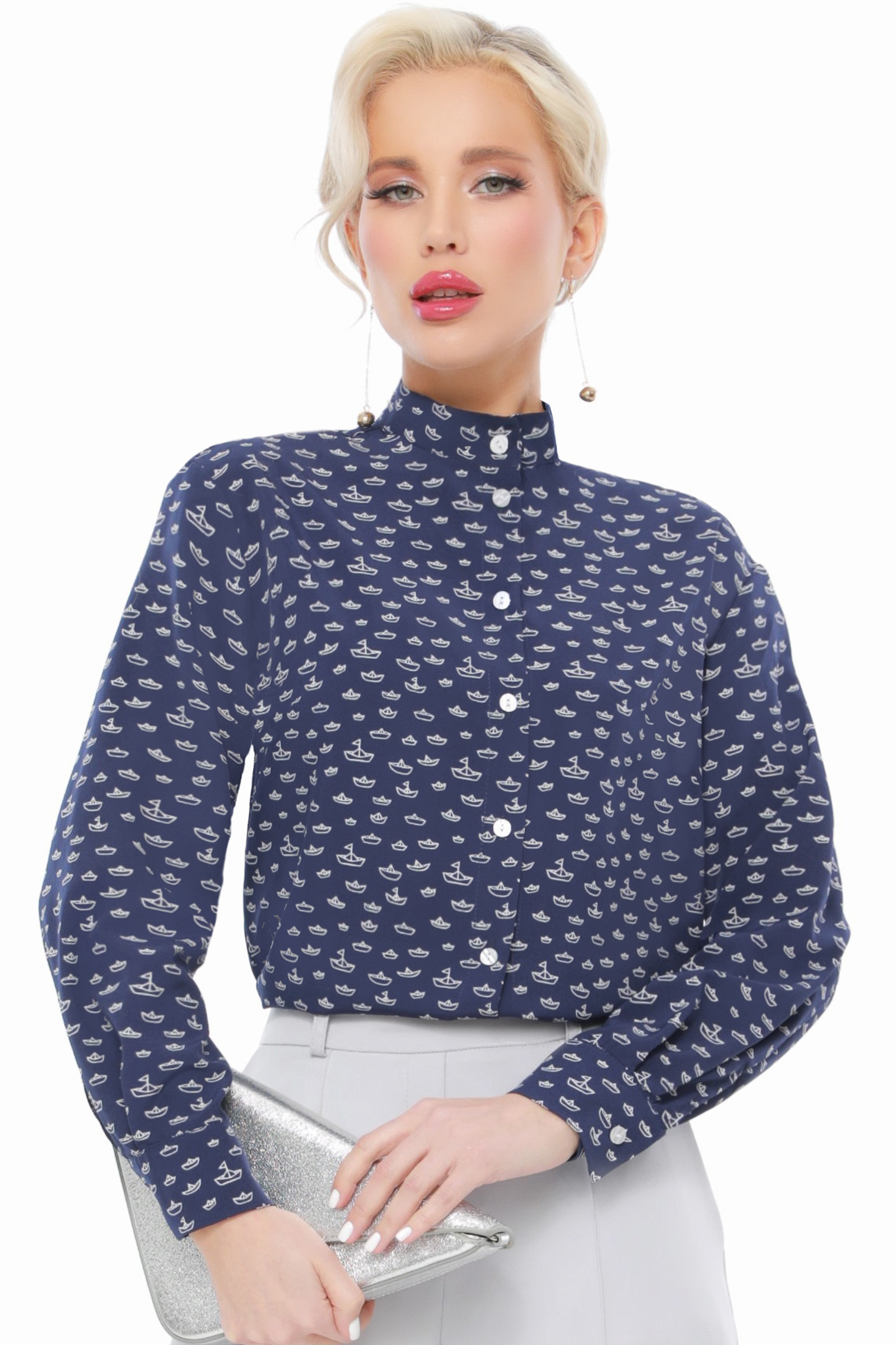 Блузка имеет воротник-стойку, который подчеркивает вашу шею и делает образ более изящным. Длинные рукава обеспечат комфорт в любую погоду, а застежка на пуговицы позволяет легко регулировать уровень облегания. Эта модель станет отличным дополнением к вашему гардеробу и прекрасно сочетается с юбками, брюками и даже джинсами.