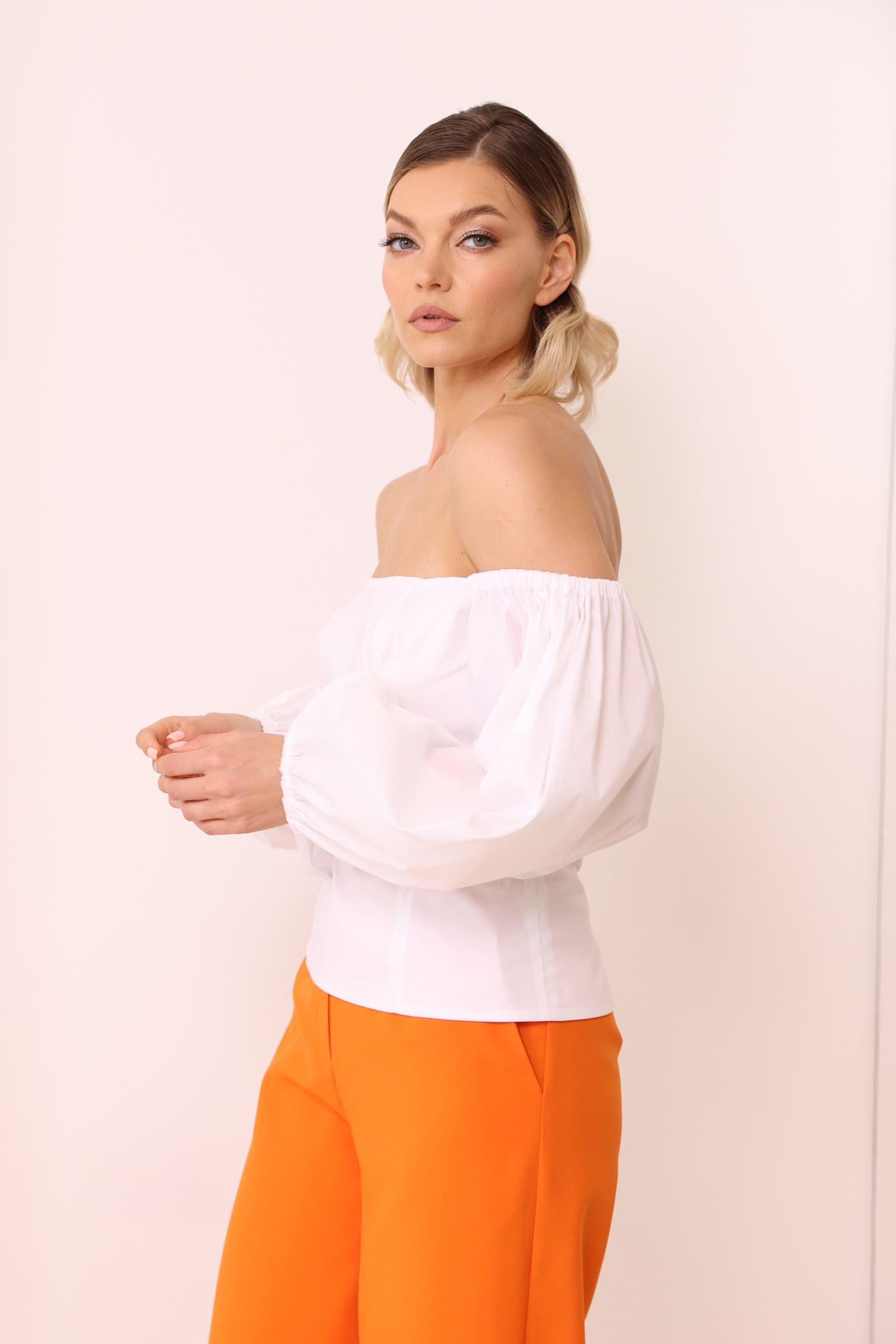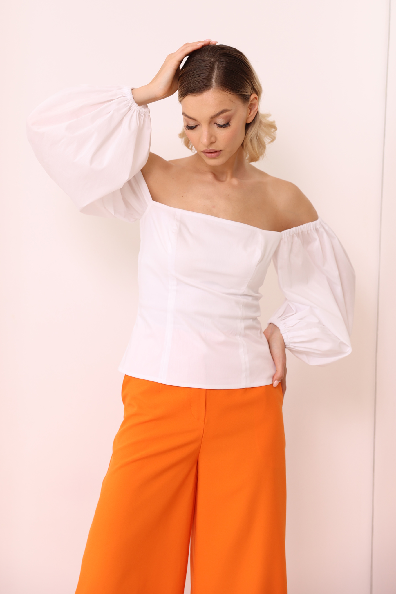Блузка-топ корсетного стиля. Застёгивается на молнию по спинке изделия. Пышный, притачной рукав с резинкой по плечу и манжету.
