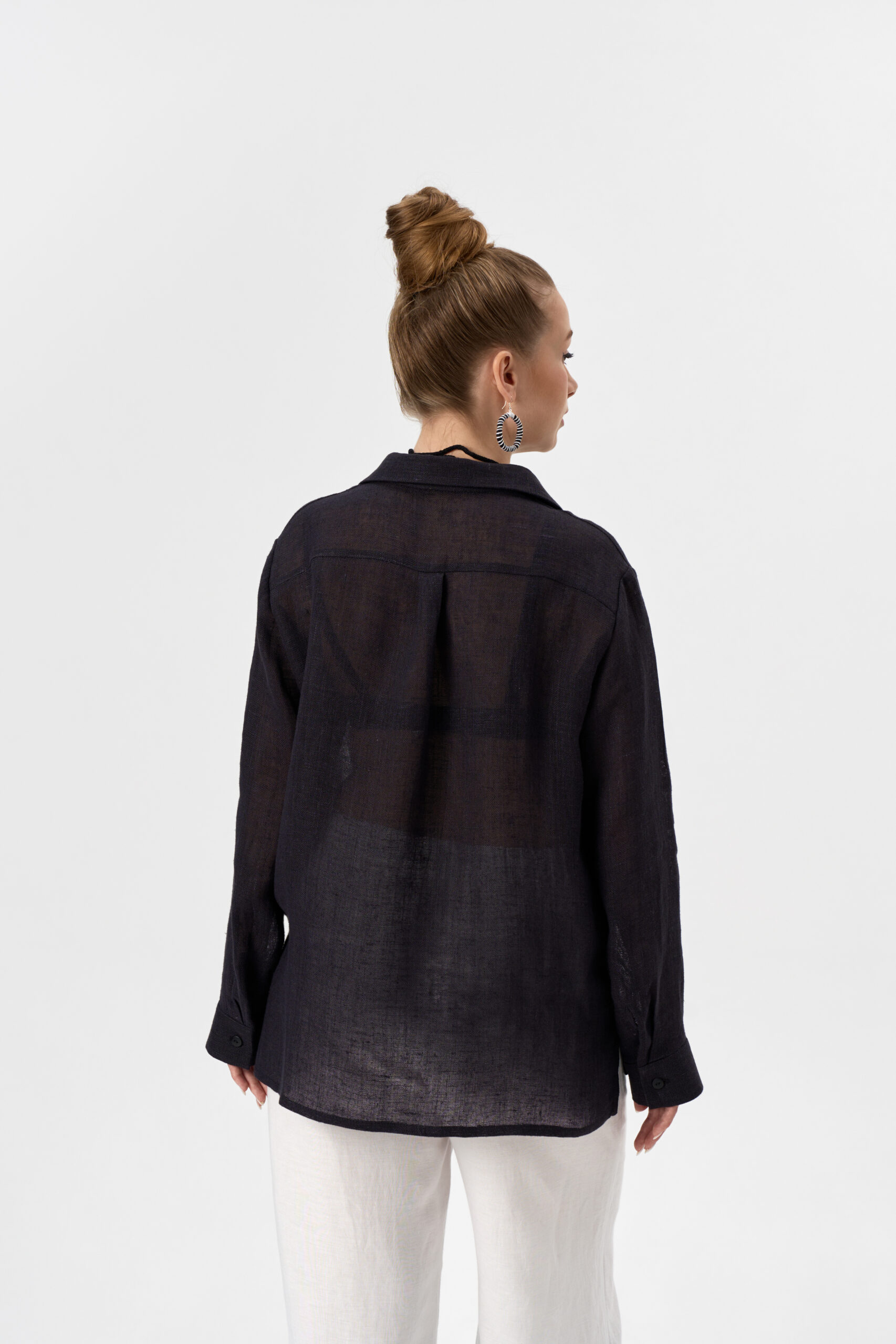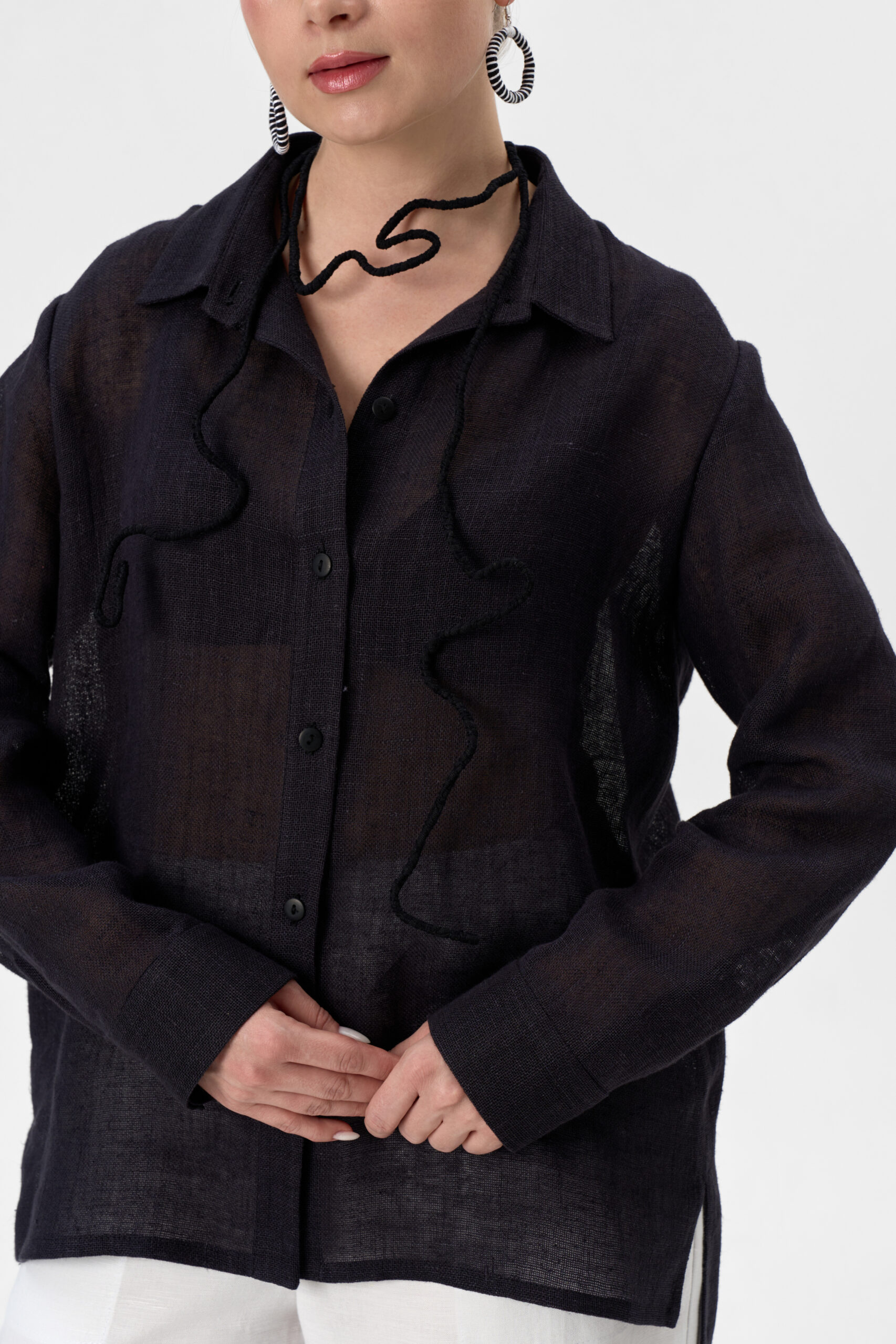 Рубашка женская прямая с удлиненной спинкой. Рукав втачной длинный на широкой манжете. Застежка центральная на пуговицы. Воротник рубашечный на стойке.. В боковых швах разрезы. Ткань разреженного переплетения.