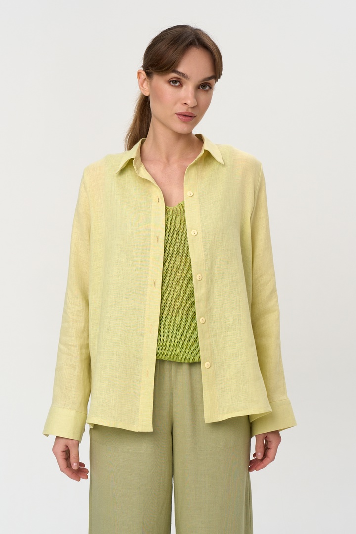 Рубашка женская прямая с удлиненной спинкой. Рукав втачной длинный на манжете. Застежка центральная на пуговицы. Воротник рубашечный на стойке. В боковых швах разрезы.
