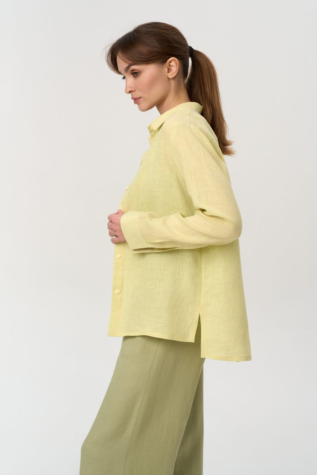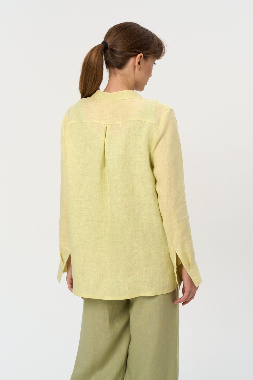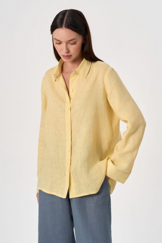 Рубашка женская прямая с удлиненной спинкой. Рукав втачной длинный на манжете. Застежка центральная на пуговицы. Воротник рубашечный на стойке. В боковых швах разрезы.