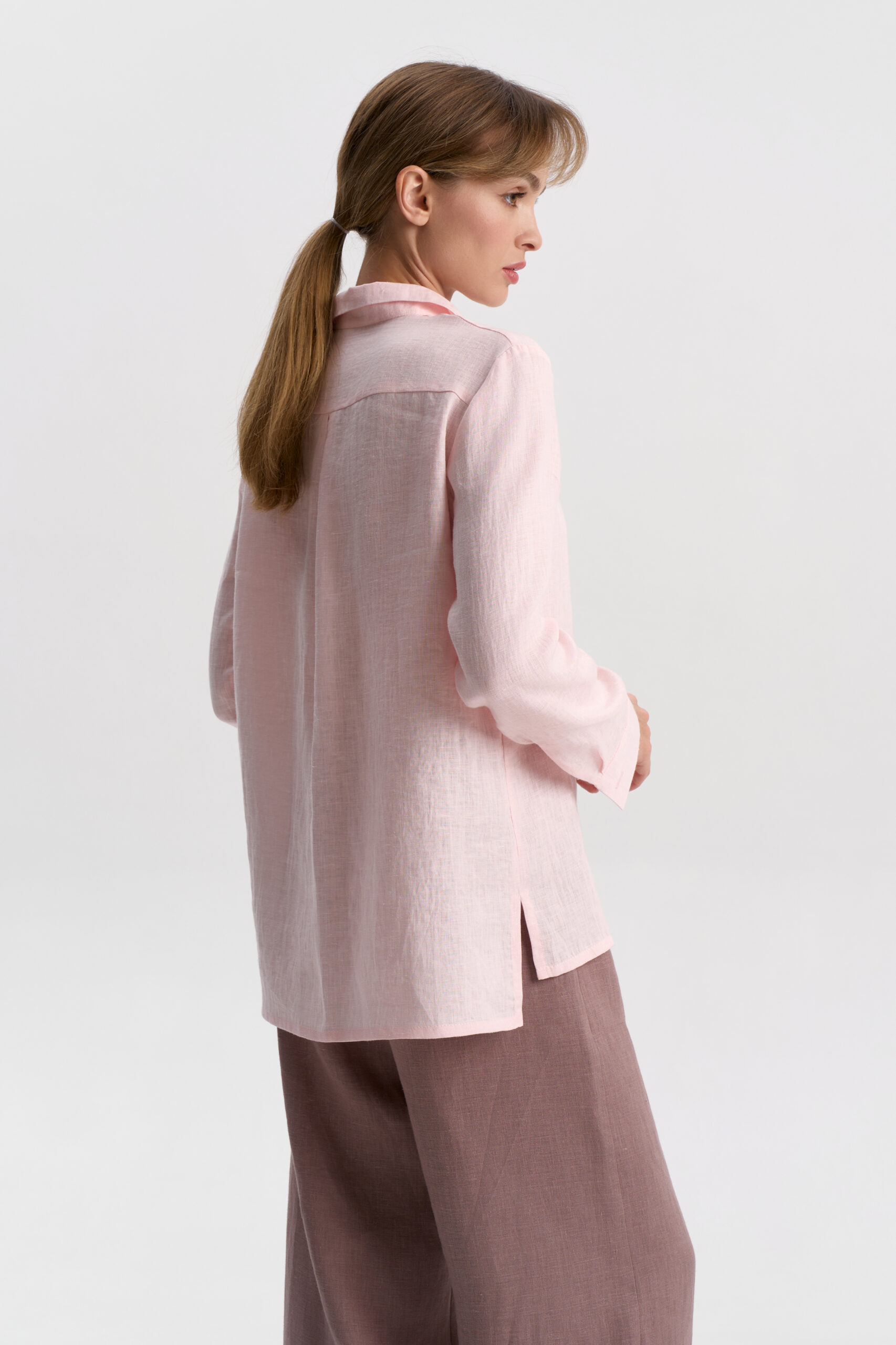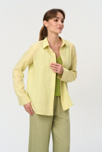 Рубашка женская прямая с удлиненной спинкой. Рукав втачной длинный на манжете. Застежка центральная на пуговицы. Воротник рубашечный на стойке. В боковых швах разрезы.